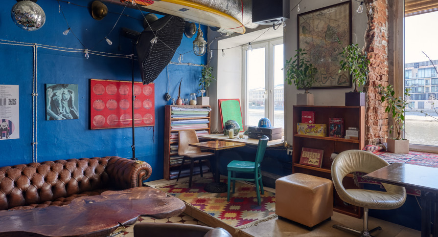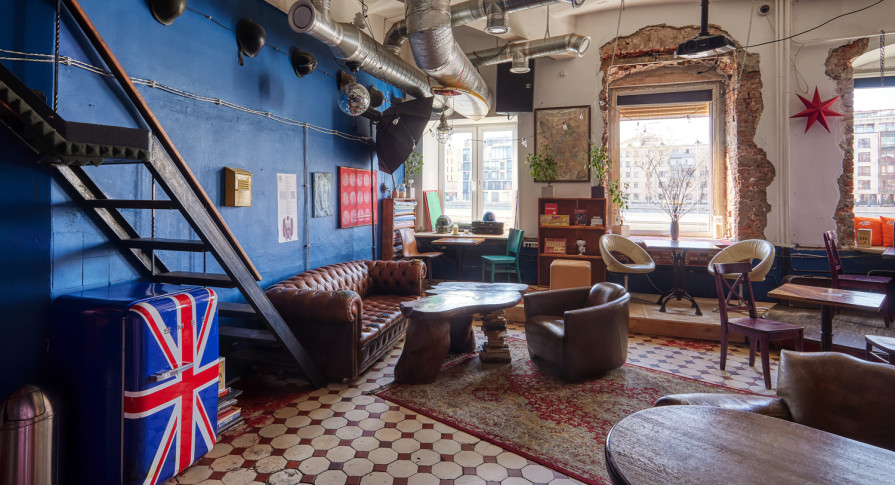 В баре создали обстановку «для своих»: уютное двухуровневое помещение с видом на Москву-реку, нарочито обшарпанные бетонные стены, простая домашняя мебель, множество мелочей на полках, приглушенный свет.