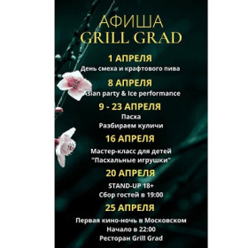В меню ресторана Grill Grad на улице Солнечная собраны блюда кавказской и европейской кухни, часть из которых готовят на мангале. В обед готовят царскую уху с сёмгой и креветками, традиционные для Грузии лобио с красной фасолью в горшочке и харчо с говядиной и кавказскими специями, армянский спас из мацуна, а также борщ и грибной капучино. Среди основных блюд — паста нери с морепродуктами, мясная лазанья, долма и ишли кюфта, запечённая баранья голень и чкмерули.