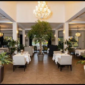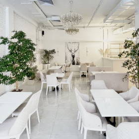 Белоснежный ресторан в Зеленограде на Панфиловском проспекте. Самый светлый, просторный, воздушный ресторан в городе. Белоснежный зал и 4х метровые потолки, увенчанные люстрами, панорамные окна с видом на лес и только живые растения в зале.