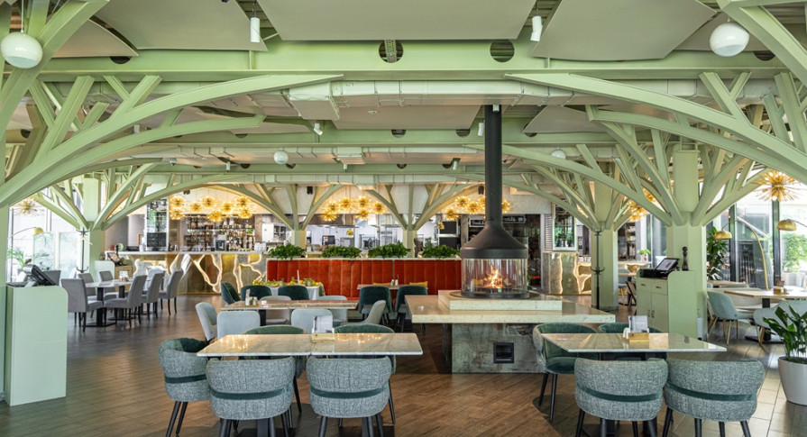 - Летняя терраса на 80 человек, утопающая в зелени, — идеальный вариант для праздника под открытым небом в тёплое время года.