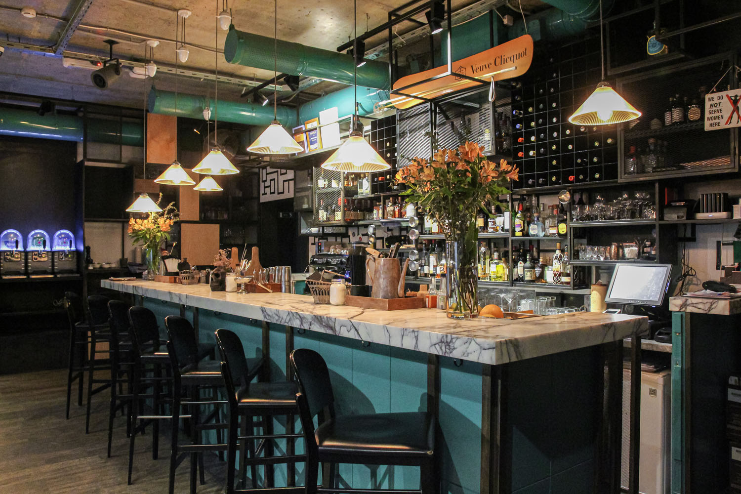 В оформлении 15 Kitchen+Bar присутствуют грубые металлические конструкции, дерево, яркие замысловатые элементы декора и мебели.
