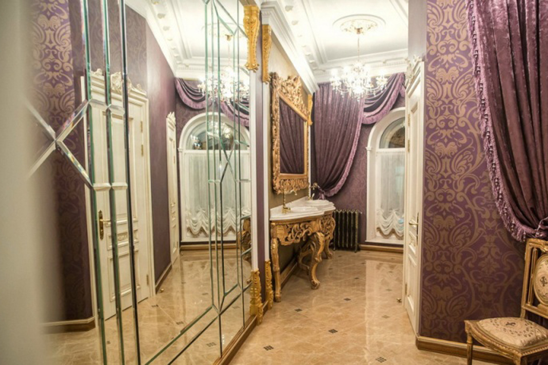 Интерьер ресторана и банкетного зала выполнены в стиле «Русский Ампир» – роскошно, торжественно и безукоризненно. Именно это мы представляем, когда слышим слово «ресторан». В оформлении – только белый цвет и золото, под высокими потолками переливаются хрустальные люстры, белоснежные скатерти и салфетки идеально накрахмалены, посуда скрипит от чистоты, а приборы отполированы до зеркального блеска. Гости поднимаются по ярко освещённым лестницам с огромными зеркалами и мраморными ступенями.