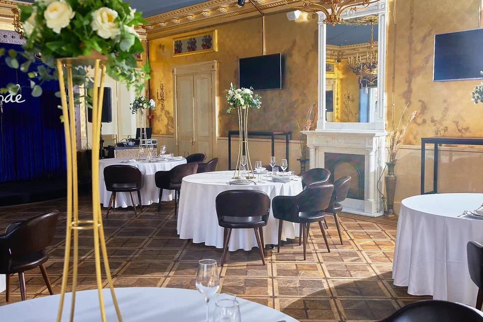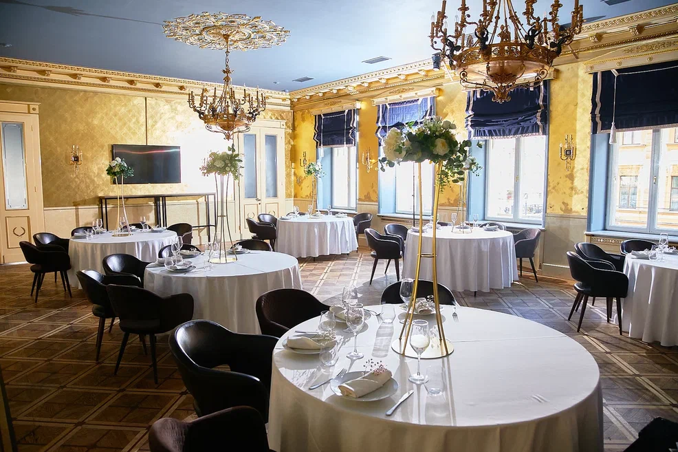 Банкетный зал «Золотой» расположен в самом центре Санкт-Петербурга в старинном особняке. Из окон банкетного зала открывается захватывающая дух панорама на главную улицу города - Невский проспект.