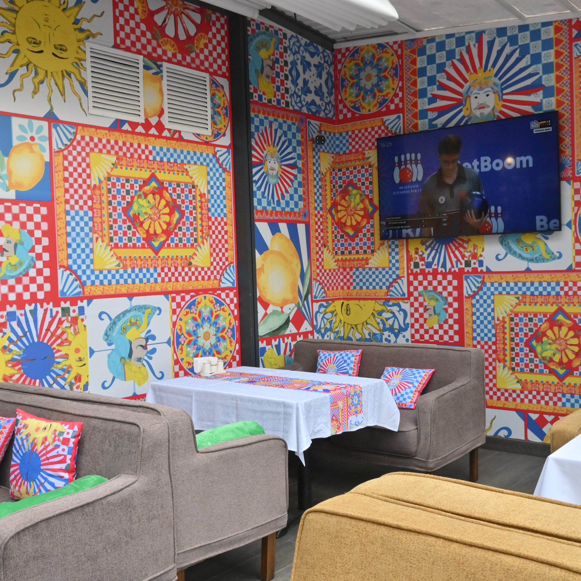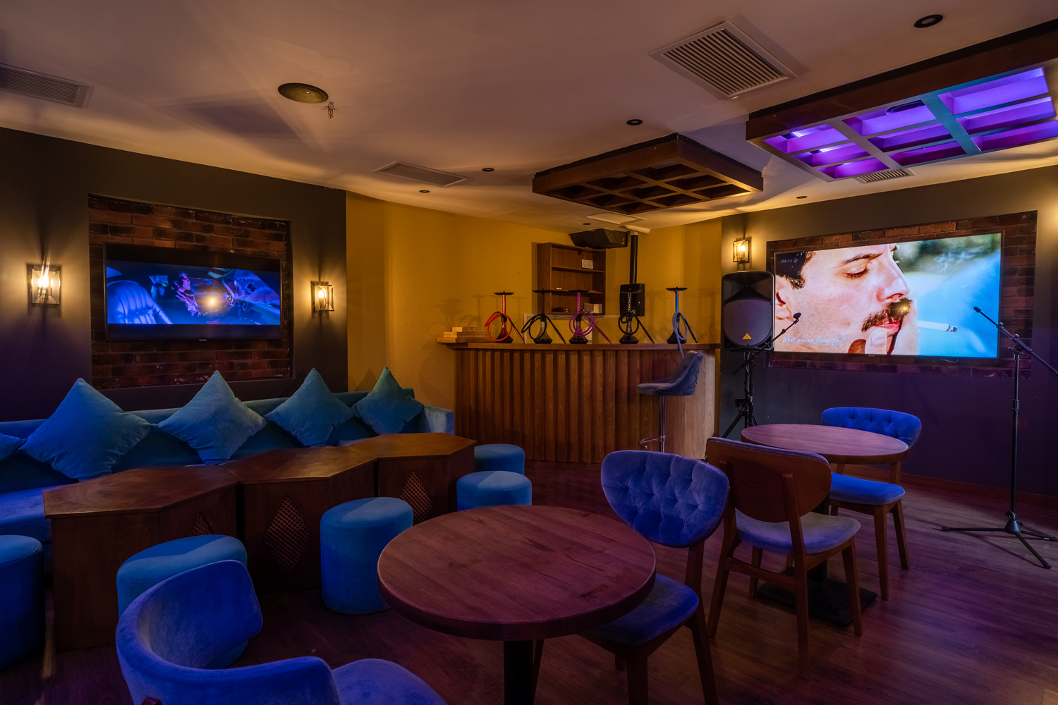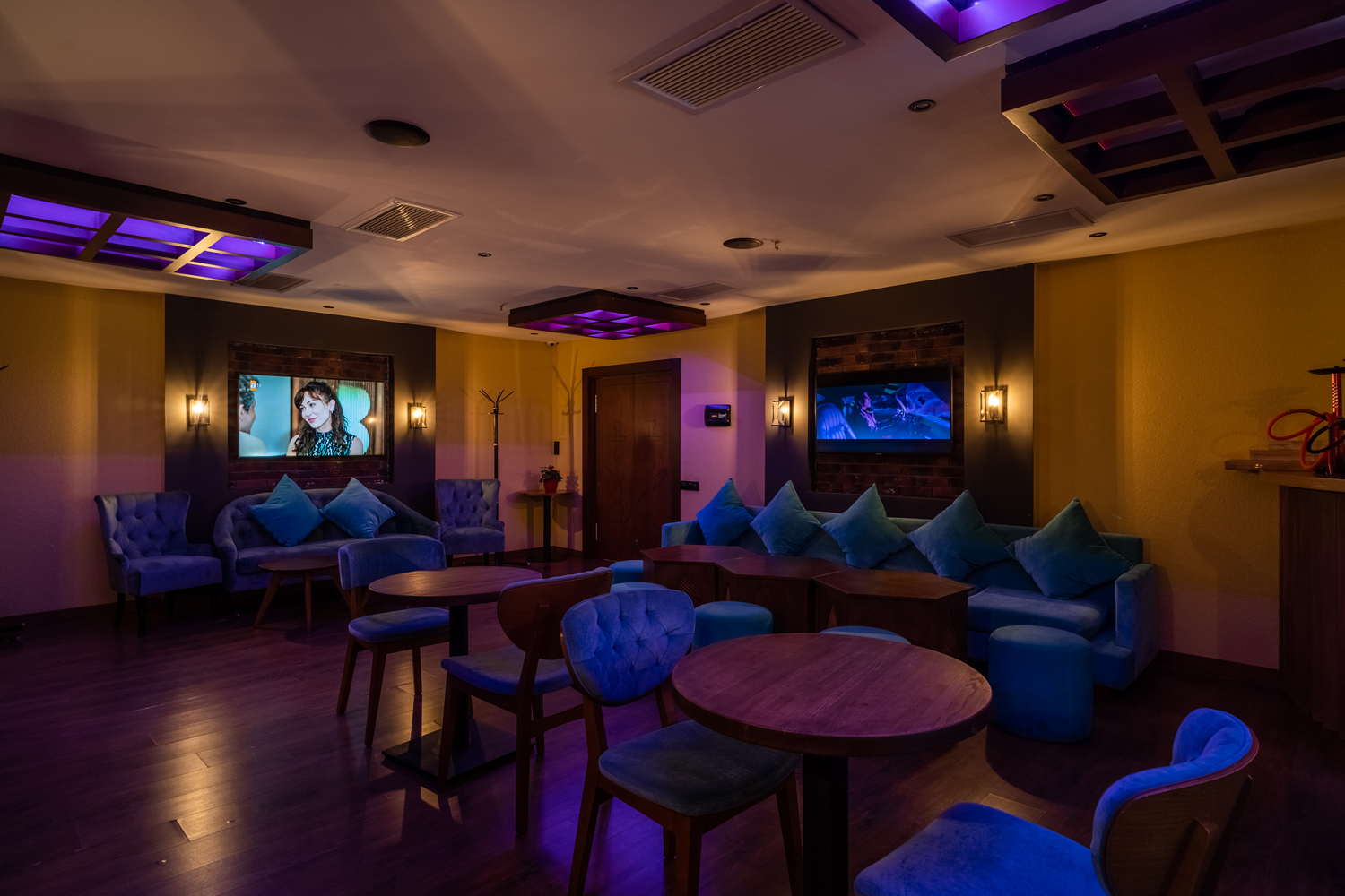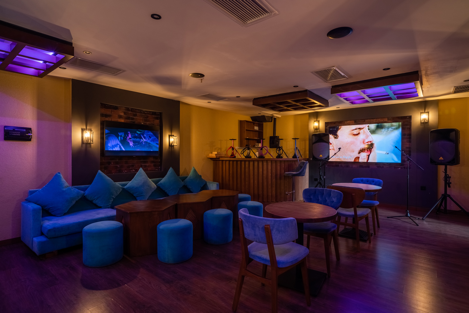 Зал оборудован барной стойкой, аудиосистемой и тремя телевизионными экранами с возможностью фото-, видео трансляции поздравлений, презентаций и т.д.