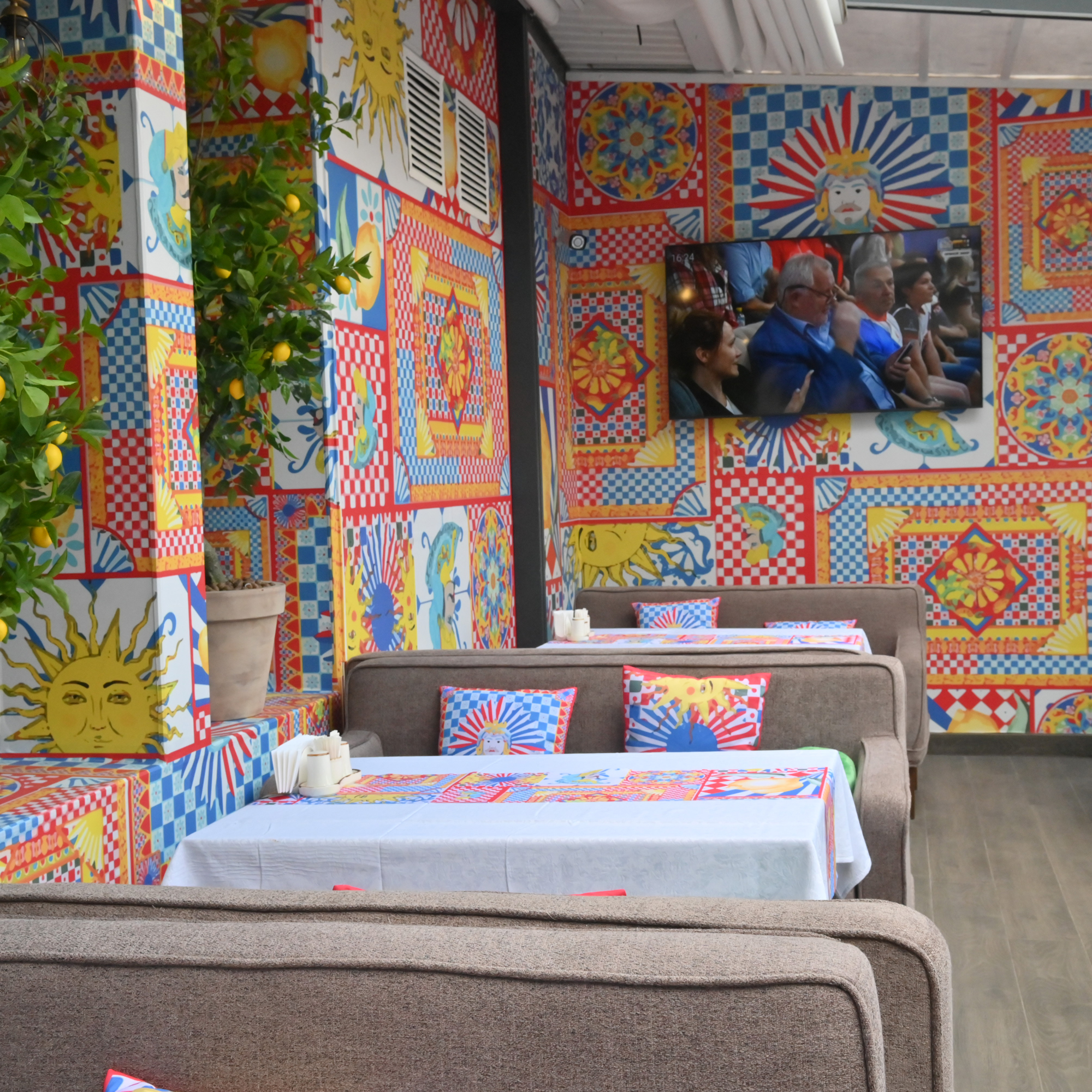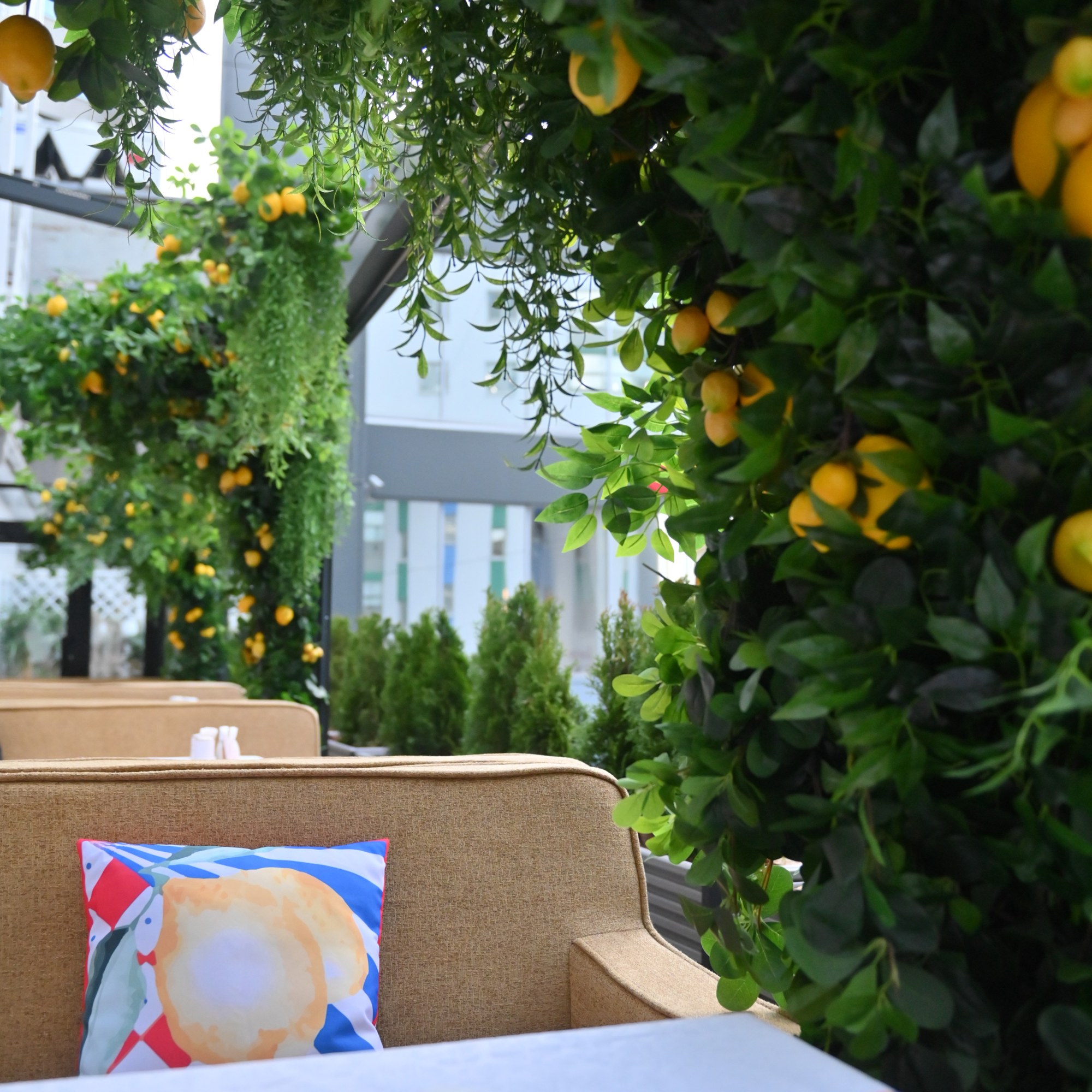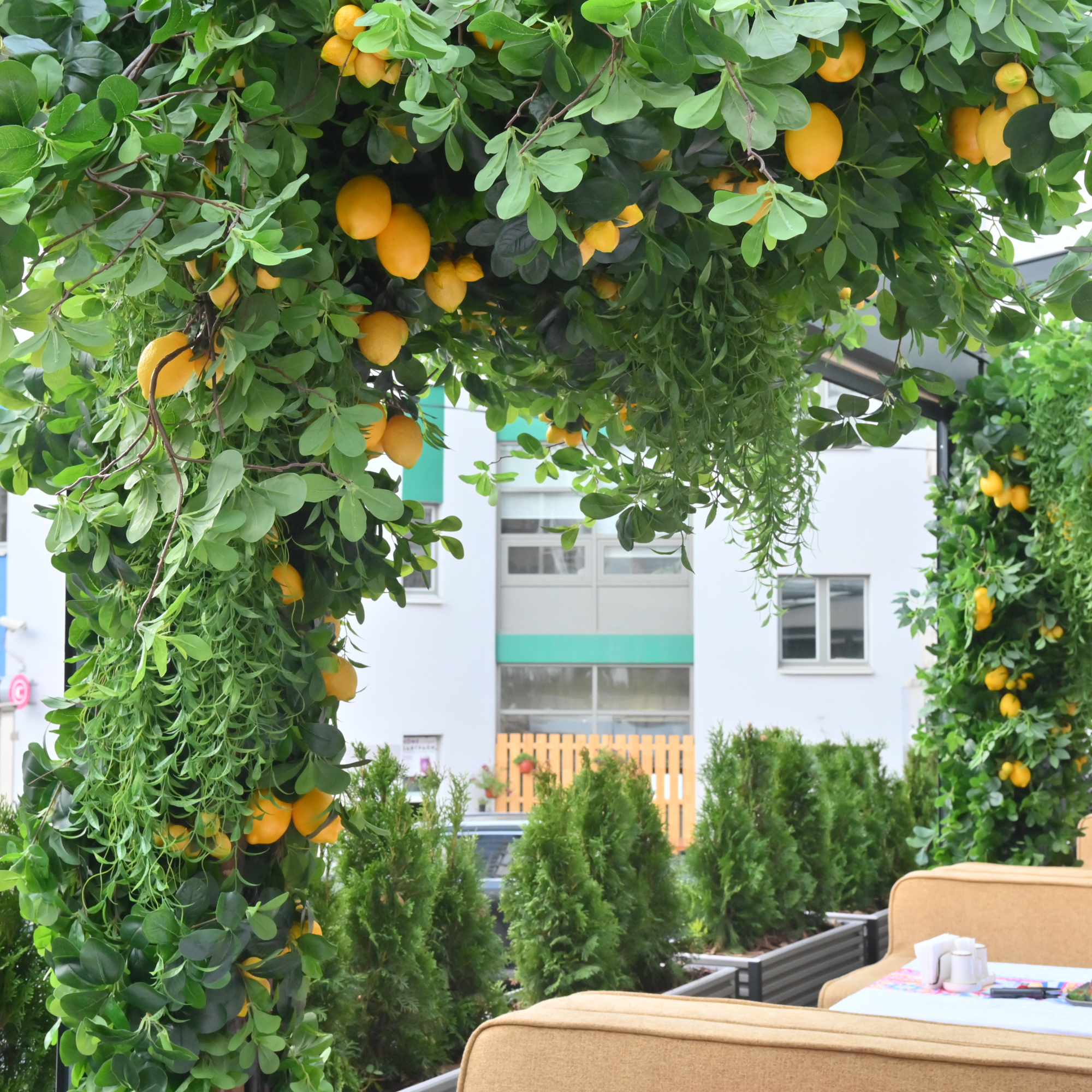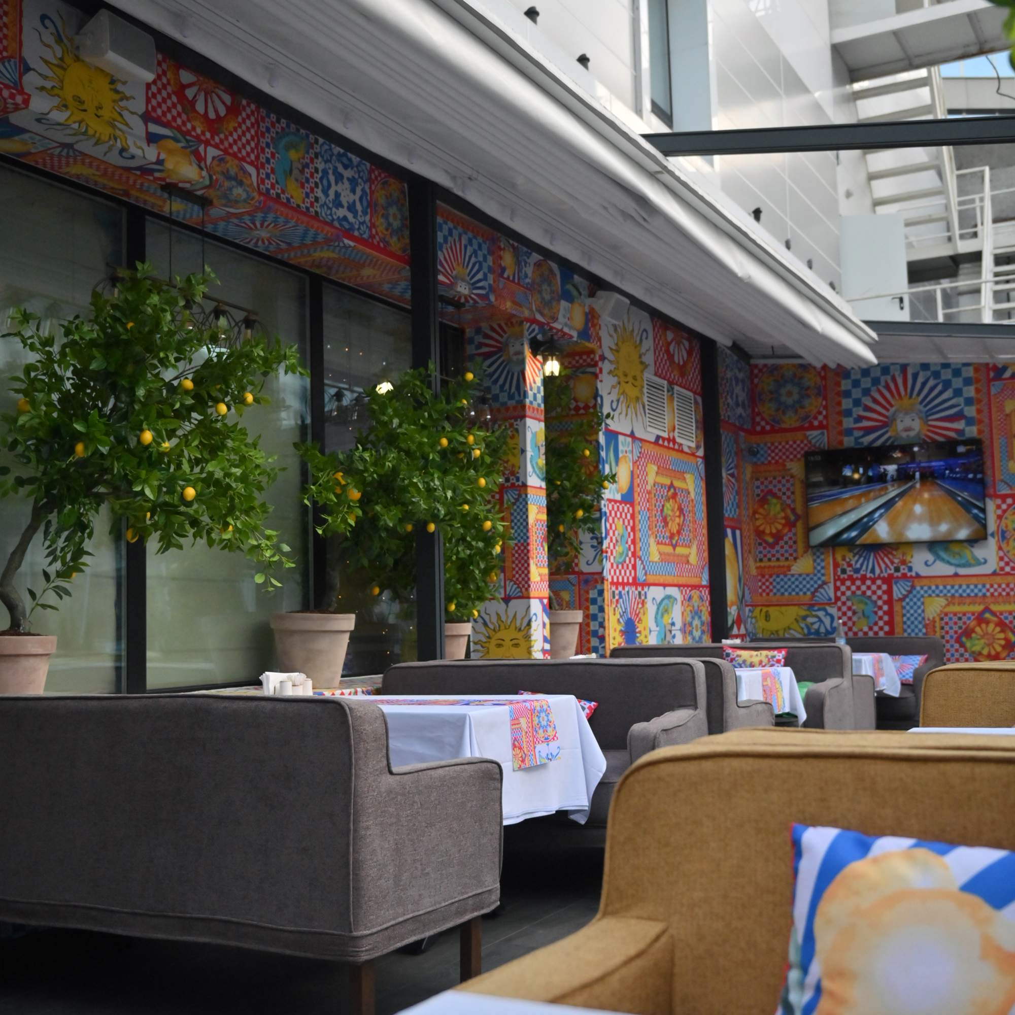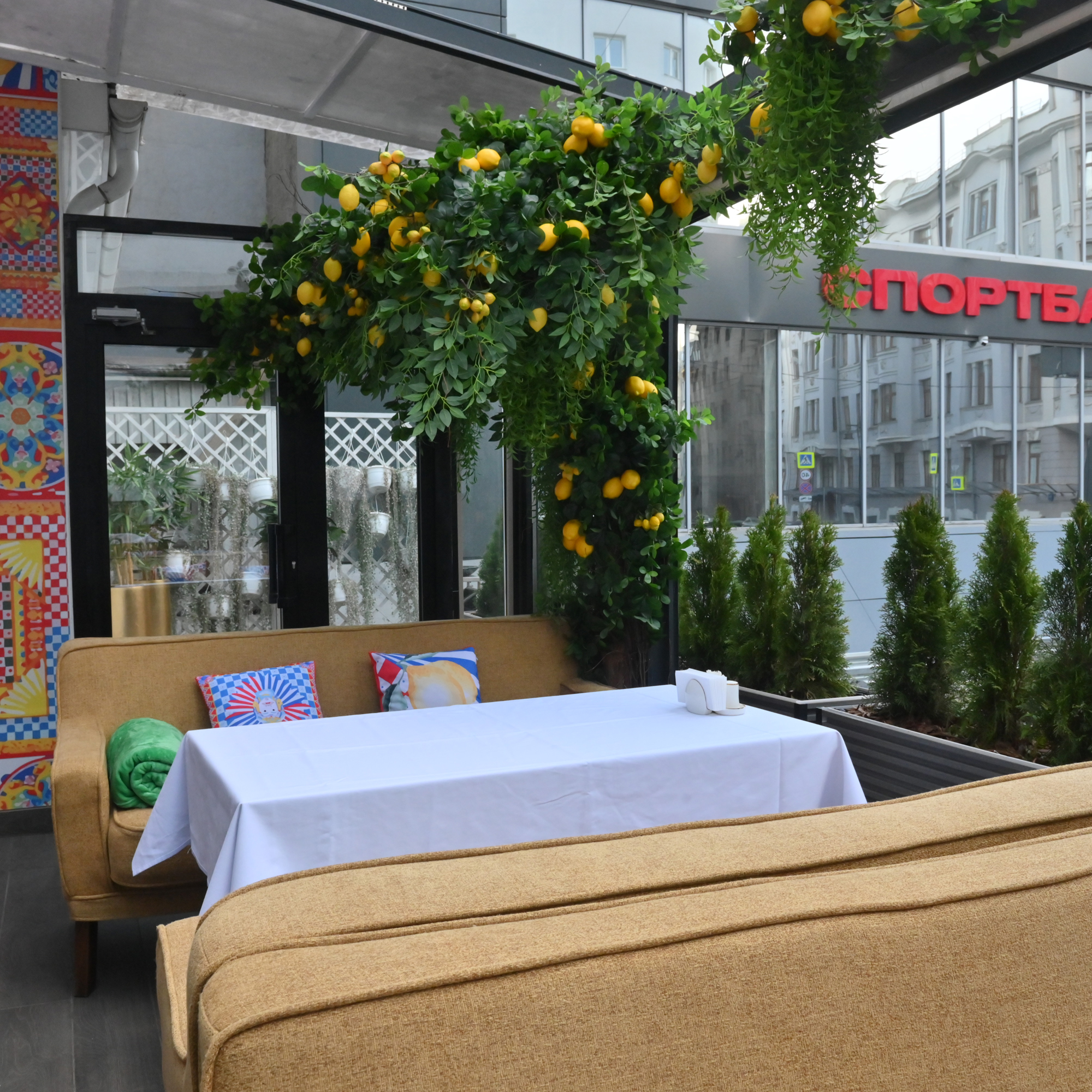 Зал имеет прямой выход на открытую оборудованную веранду, площадью более 50 кв. м, которая в летнее время оборудуется стационарными зонтами с тканевым покрытием.