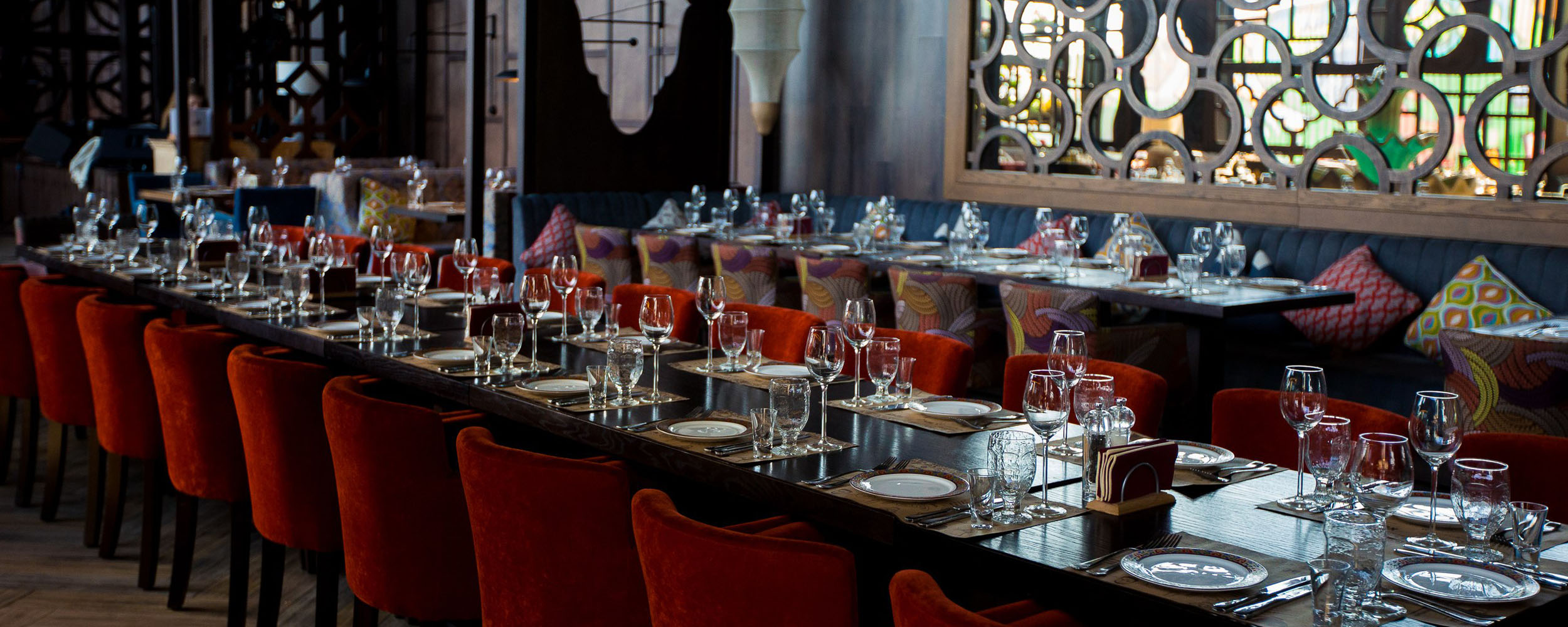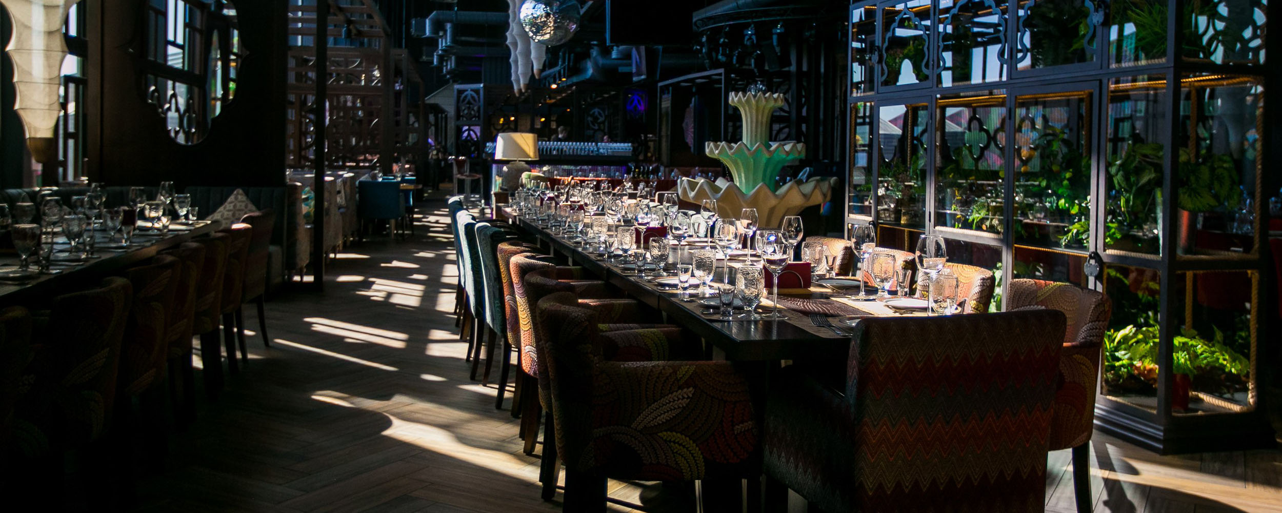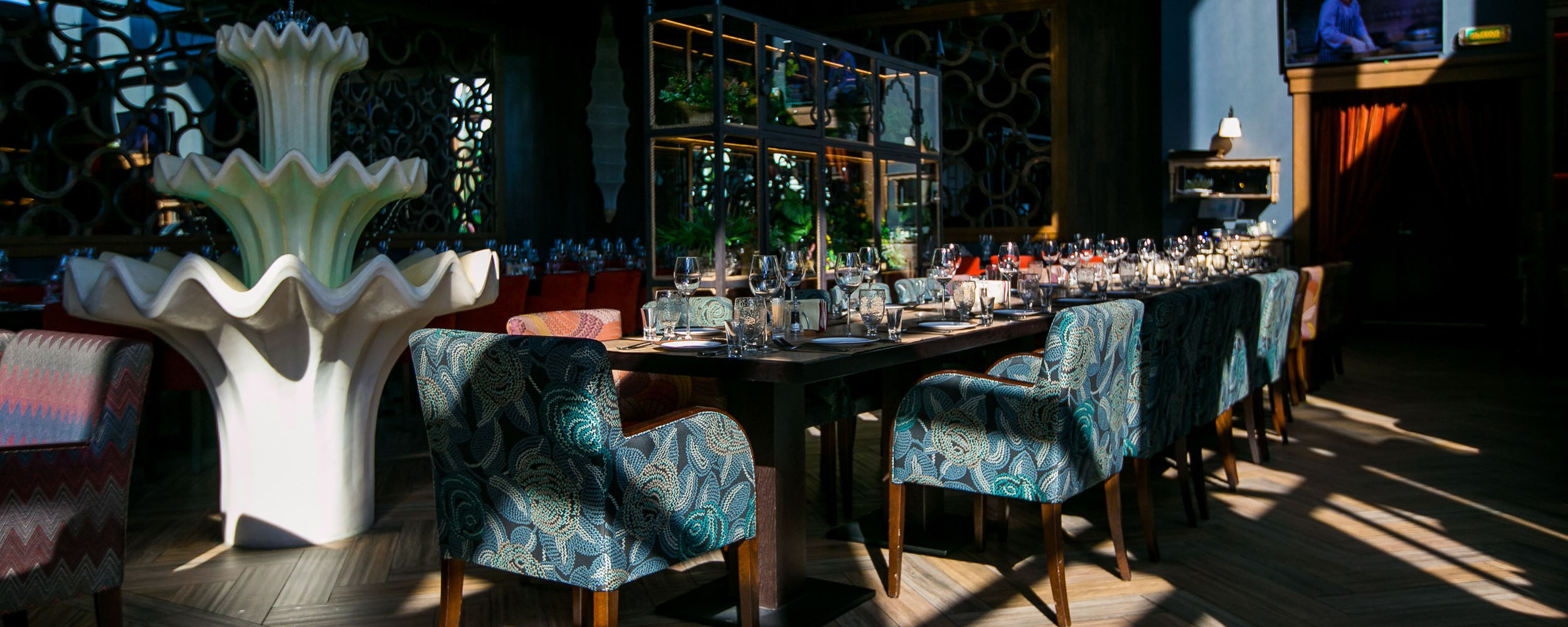 При оформлении ресторана были использованы только натуральные, легкие материалы. Восточные ковры, мебель ручной работы, мягкие диваны, шатер, резные орнаменты и восточная мозаика создают одновременно теплое и стильное пространство зала. Вместительный зал позволяют проводить пышные празднования шумными компаниями: банкеты, корпоративы и дни рождения. Есть сцена для вечерних мероприятий и танцпол. Рядом с ним расположилась контактная барная стойка.