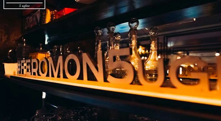 Кальянная «Feromon 5 uglov» предлагает гостям полноценное меню блюд европейской кухни, богатую алкогольную карту – крафтовое пиво, коктейли, шот-сеты, а также большой выбор бестабачных смесей и паровых коктейлей. На территории пространства проходят stand-up вечера, публика играет в настольные игры, общается, знакомится и релаксирует под ненавязчивую фоновую музыку.