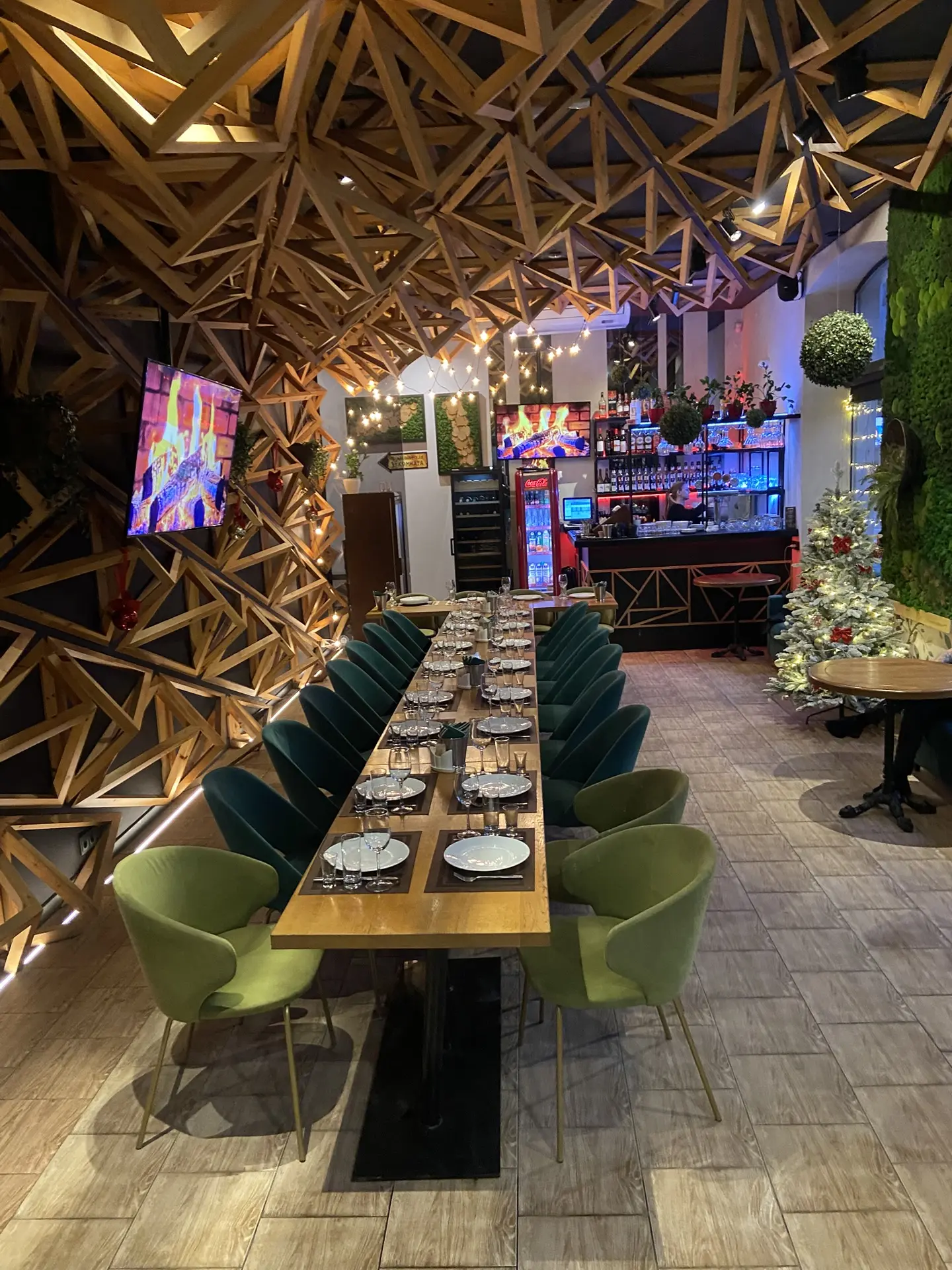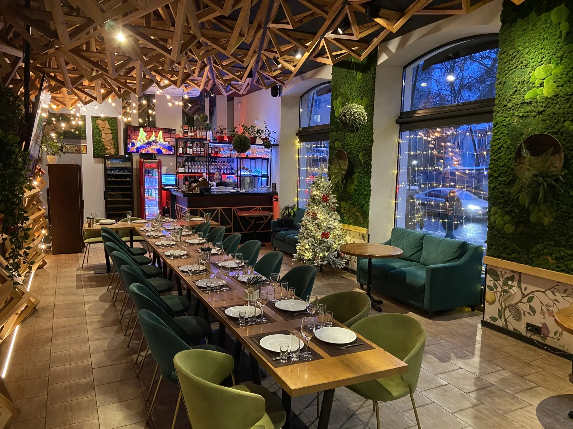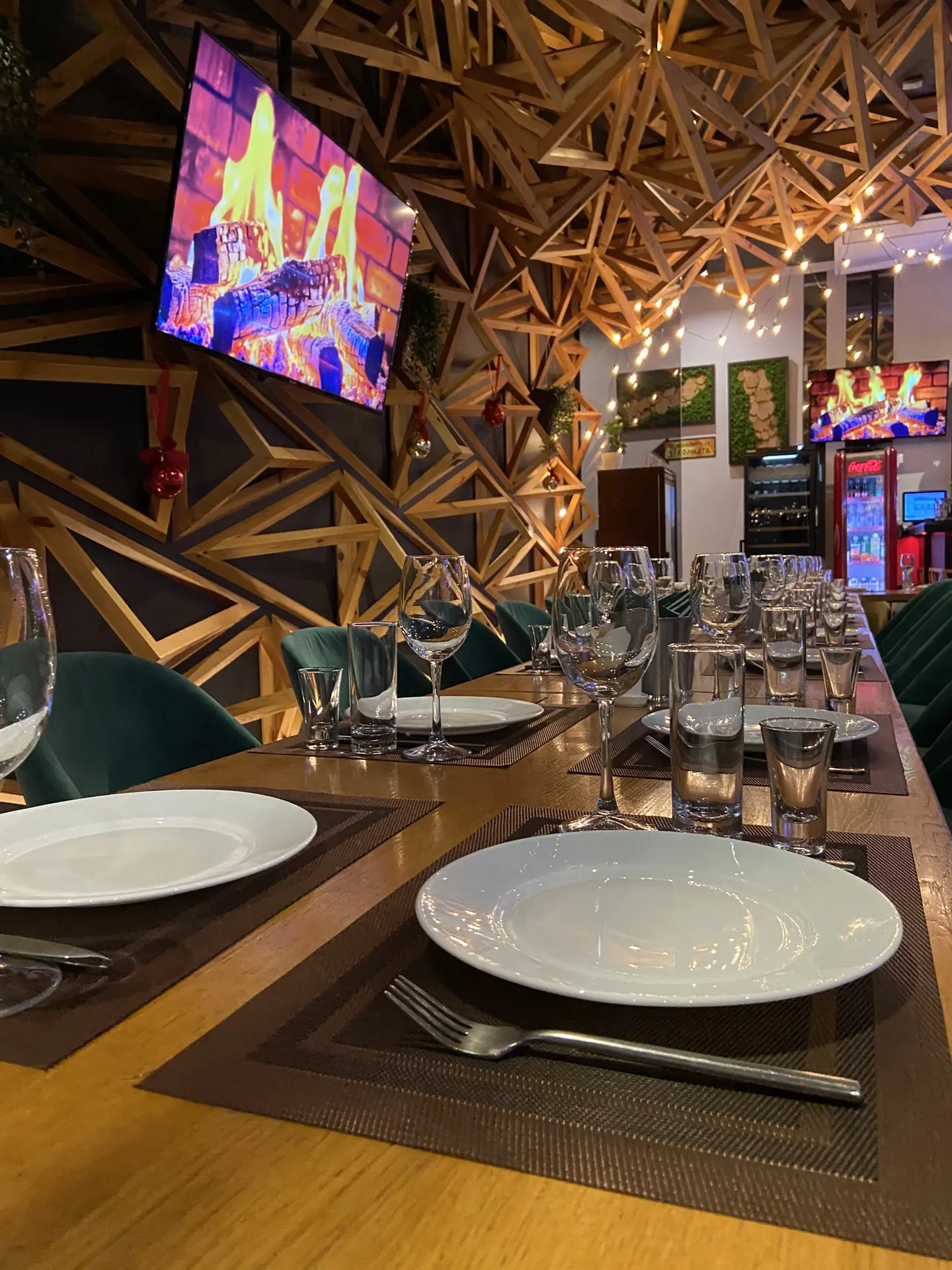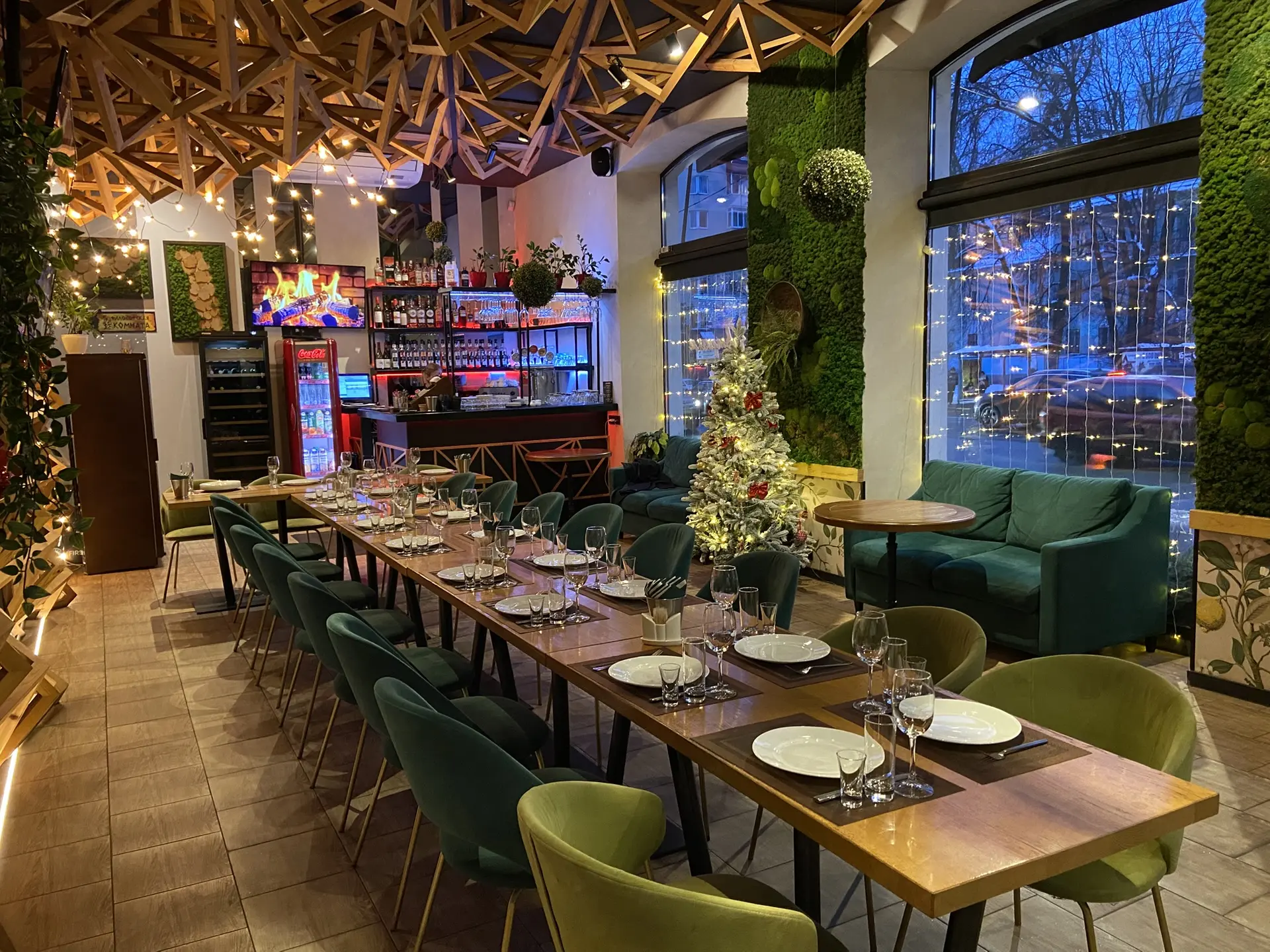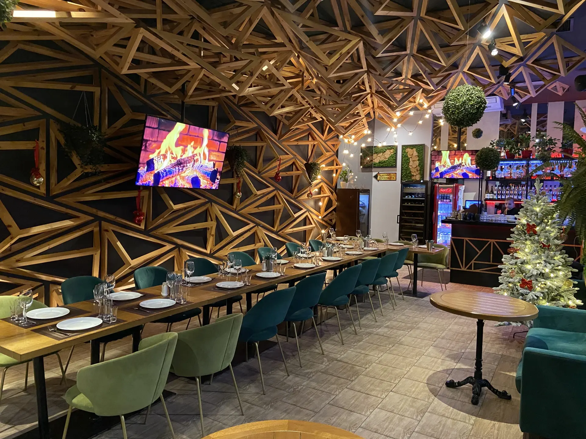 Помещение отличает уникальный дизайн: одна стена и весь потолок выполнены объёмными 3D-треугольниками, создающими эффект лёгкого движения и современный акцент. Вторая стена оформлена мягким махом (велюр/бархат), добавляя тепла и тактильного уюта. Панорамные окна наполняют зал естественным светом, а вечером — огнями города. Декор стен и продуманное зонирование делают ресторан камерным, но не тесным.