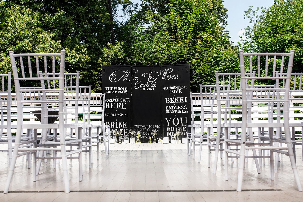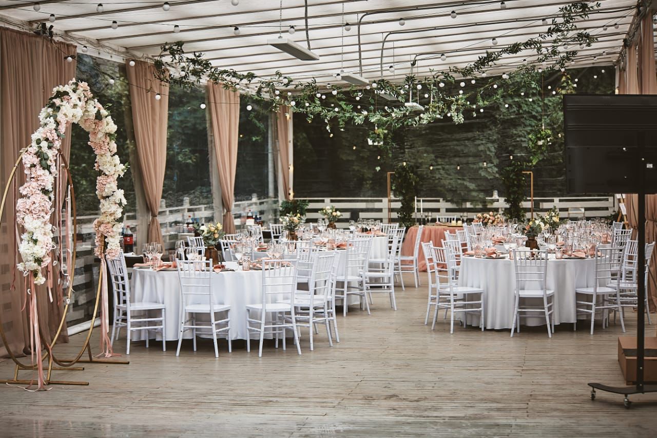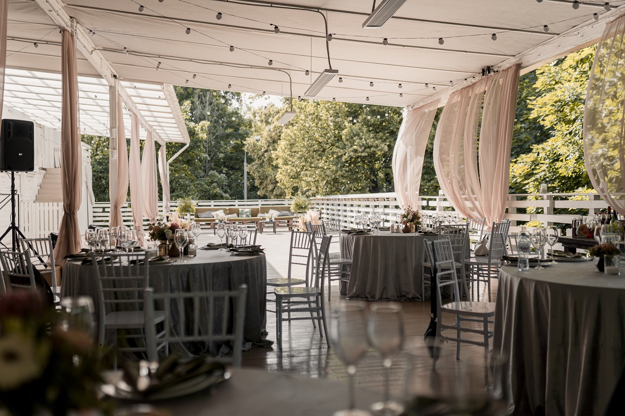 Открытая веранда, площадью 320 кв.м, которая со всех сторон окружена лесом, на площадке есть звук, свет, сцена и танцпол. Здесь могут расположиться до 150-170 человек в формате банкета (в зависимости от рассадки), а в фуршетном формате – более 250.