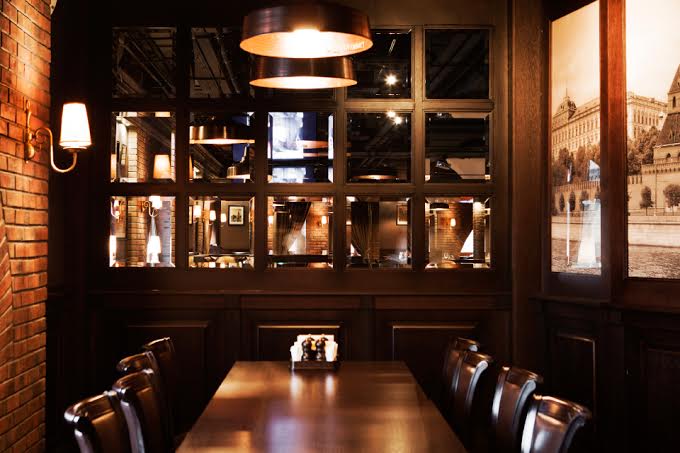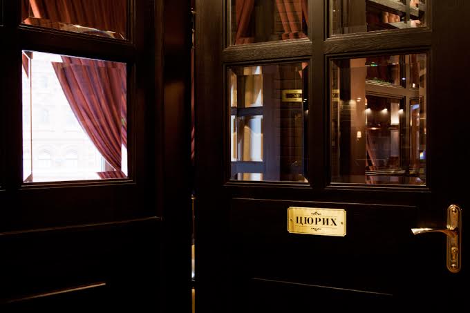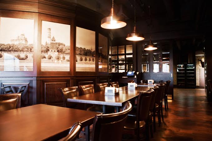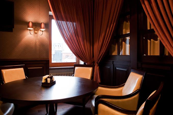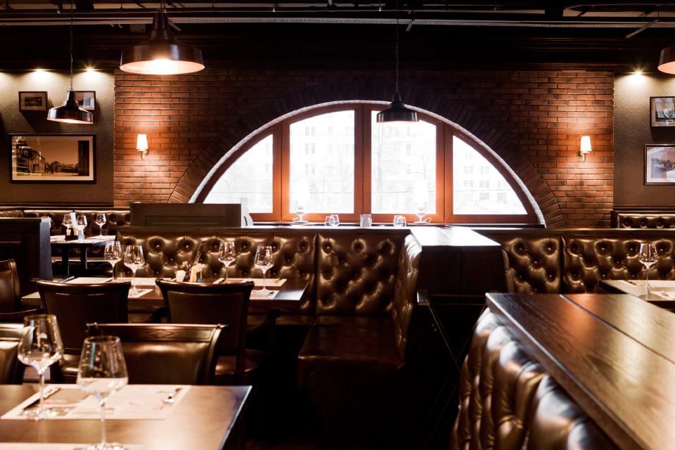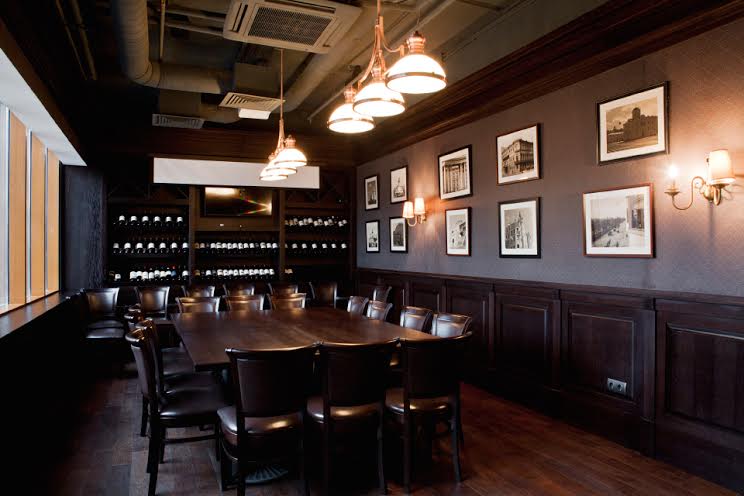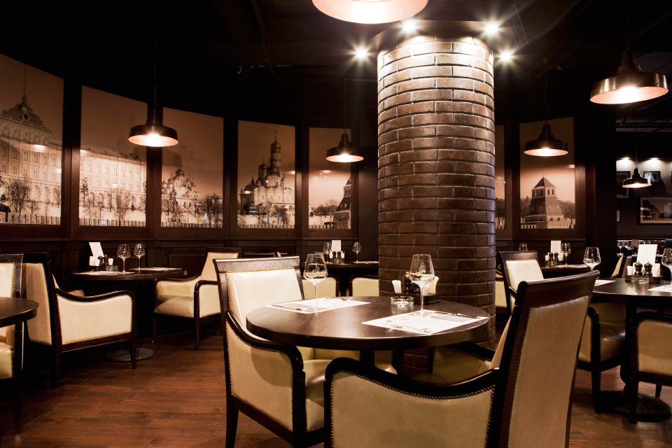 Традиционный интерьер в стилистике бренда GOODMAN с темной кожей и деревом дополнен фотографиями и элементами декора в стиле старой Москвы, что вместе с уникальным видом на Кремль создает эффект погружения в эпоху начала ХХ столетия.