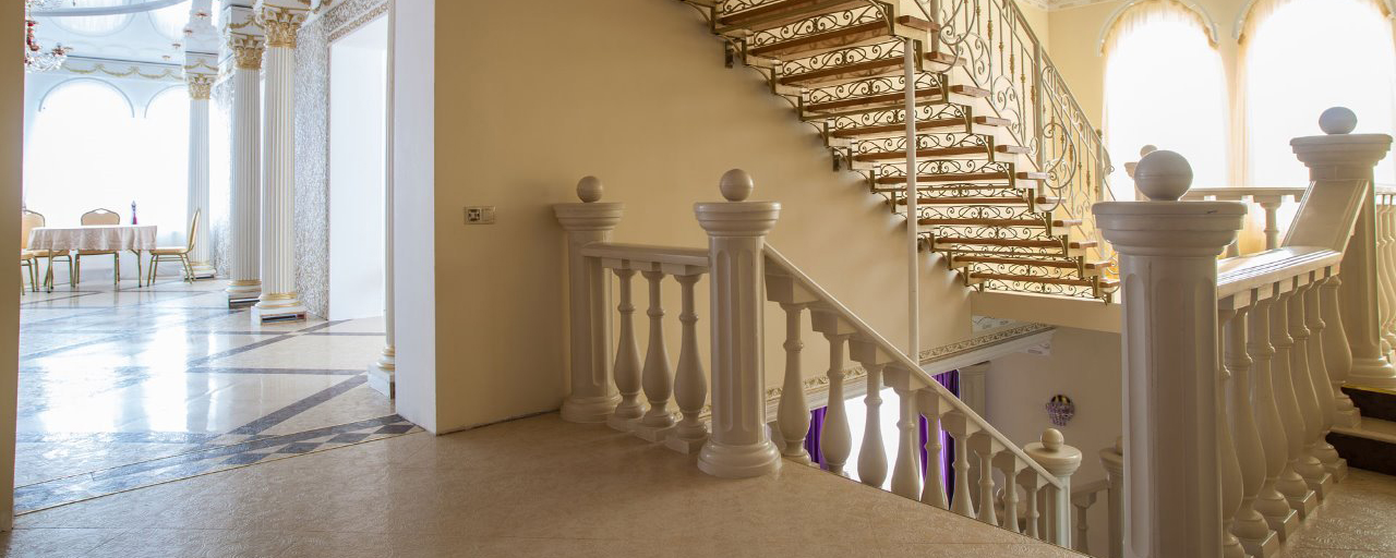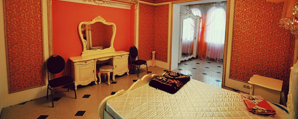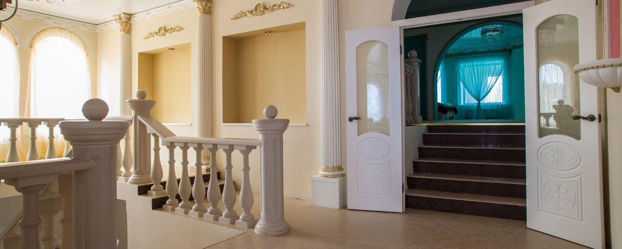 - Оформление интерьера в дворцовом стиле – с мрамором, позолотой, колоннами, хрустальными люстрами и бра, высокими потолками с лепниной, стенами с линкрустой и камином, отделанным натуральным мрамором.