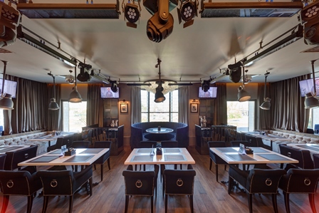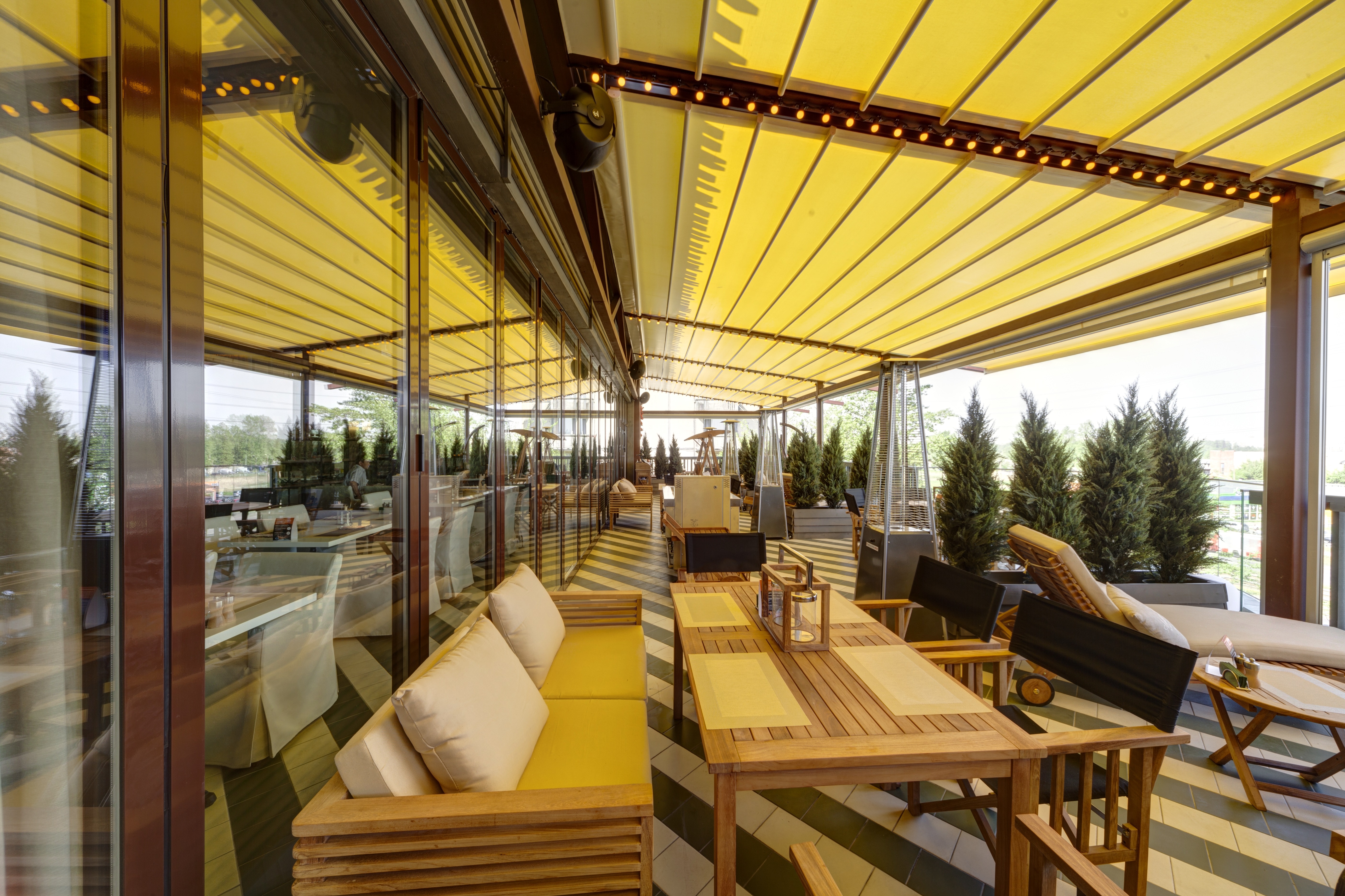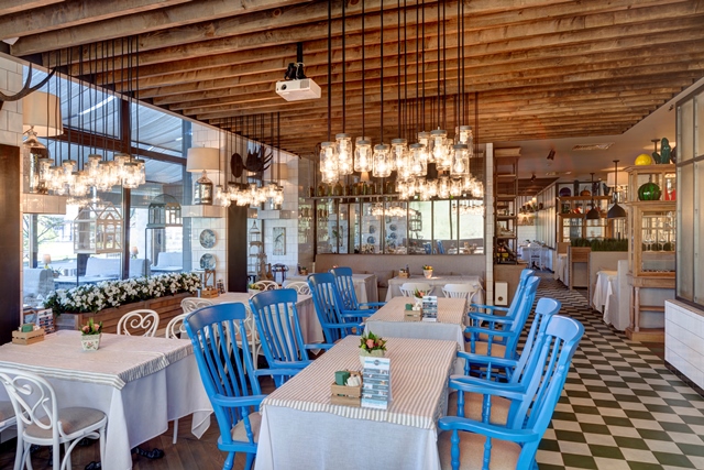 Банкетный зал и открытая летняя терраса с трансформирующейся крышей, где под открытым небом готовят мясо на вертеле, a гостям предлагают самостоятельно приготовить блюдо на раскаленных камнях.