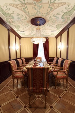 Это небольшой ресторан, состоящий всего из нескольких столиков. Интерьер ресторана выполнен в духе русского стиля ампир, мебель точная копия экспонатов Эрмитажа. Винтовая лестница ведет в помещение, где собраны архивные фото бывших владельцев здания.