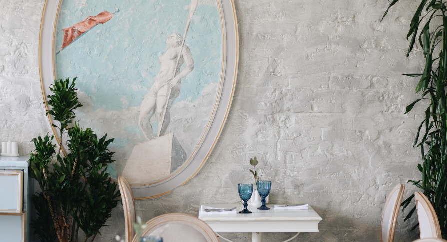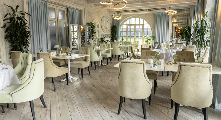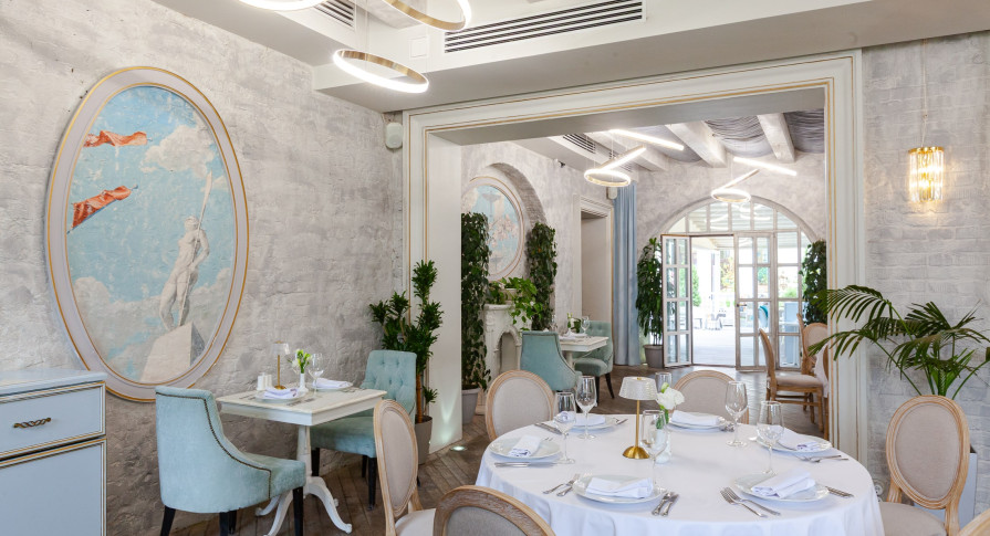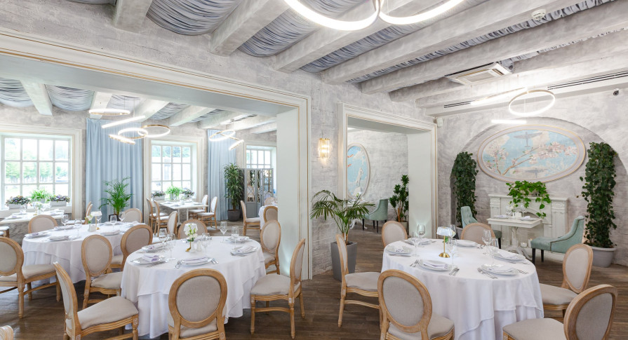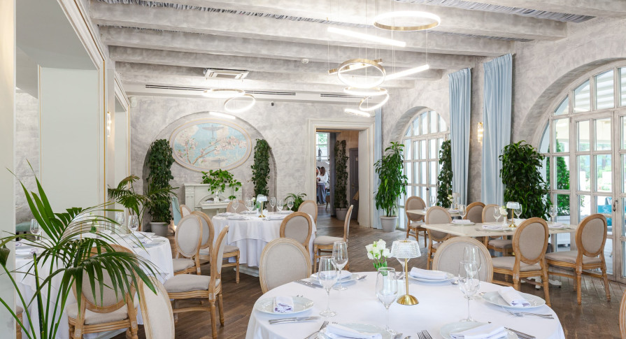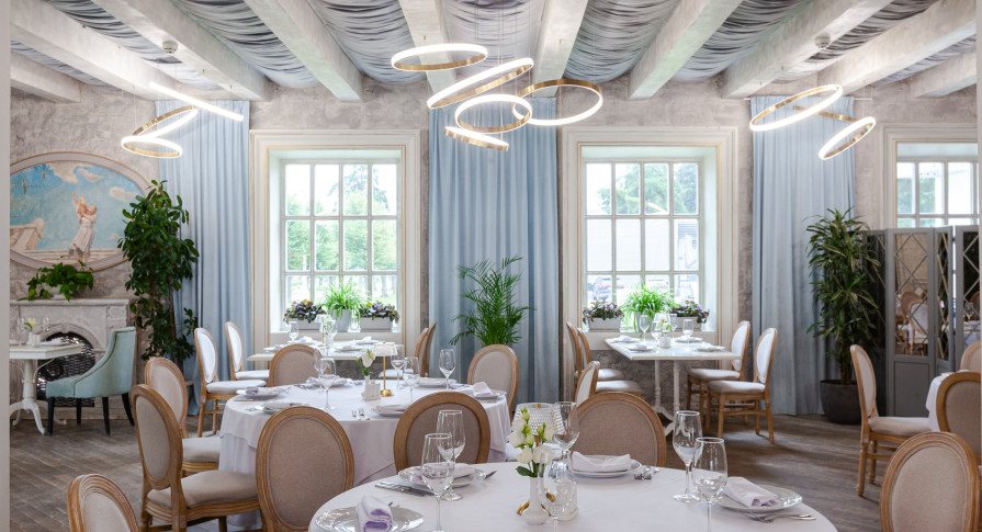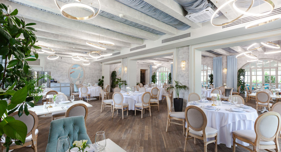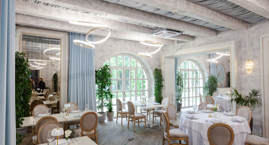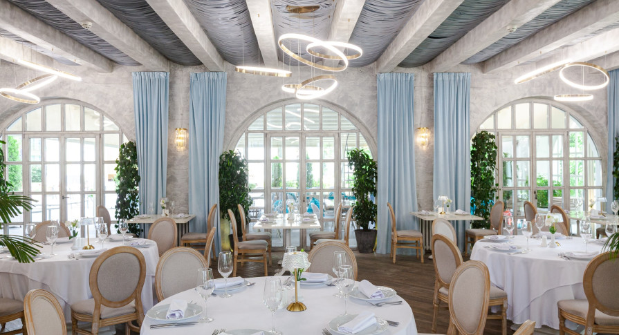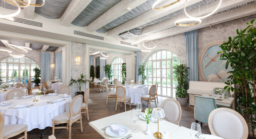 Интерьер ресторана — это сочетание классической элегантности и модернизма, создающее особую вдохновляющую атмосферу, которая отражает красоту и величие целой эпохи. Лёгкий, воздушный интерьер в небесно-голубых тонах, панорамные окна в пол с видом на парк — гармония и красота в каждой детали.
