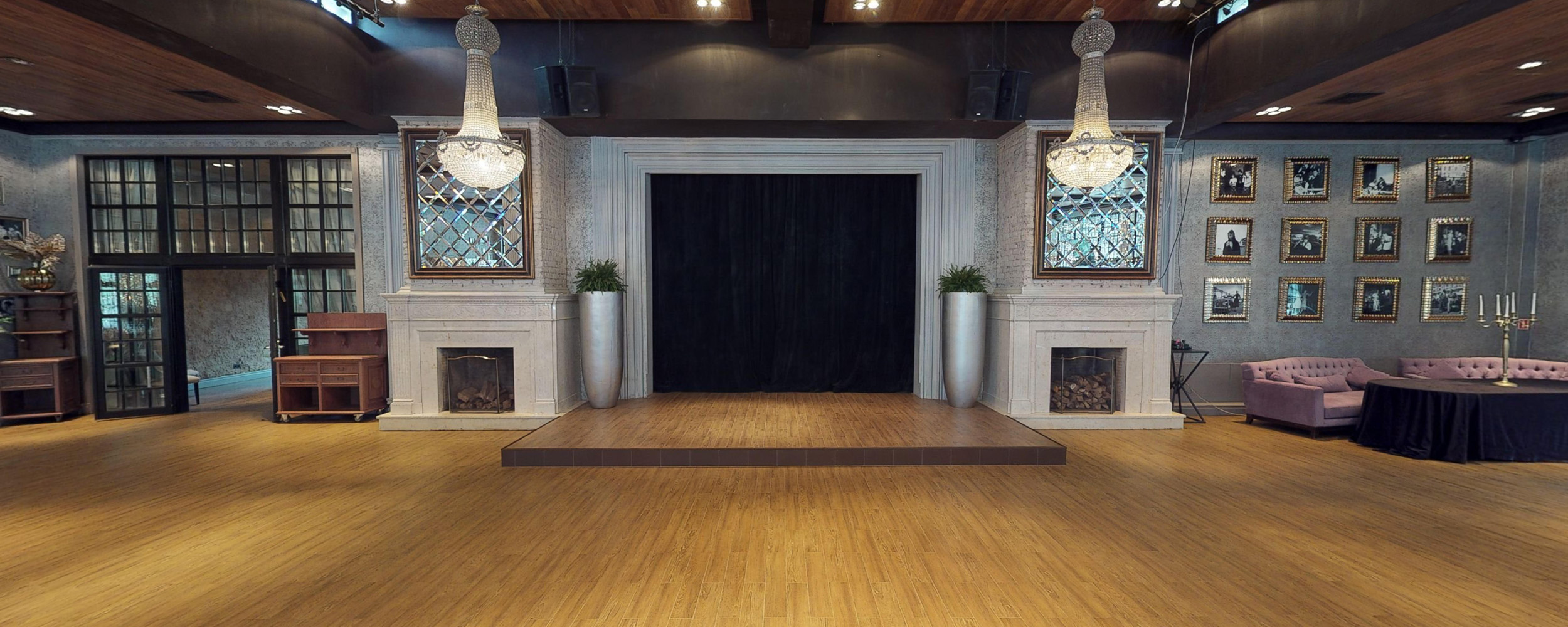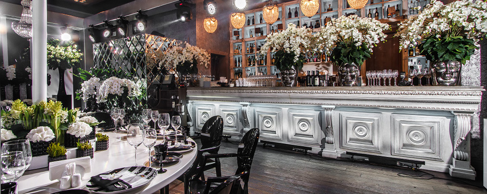 Пространство Шале едино: панорамные окна от пола до потолка, большие деревянные столы, уютные диваны, вокруг сцены два внушительных камина, на стенах трафаретная штукатурка.