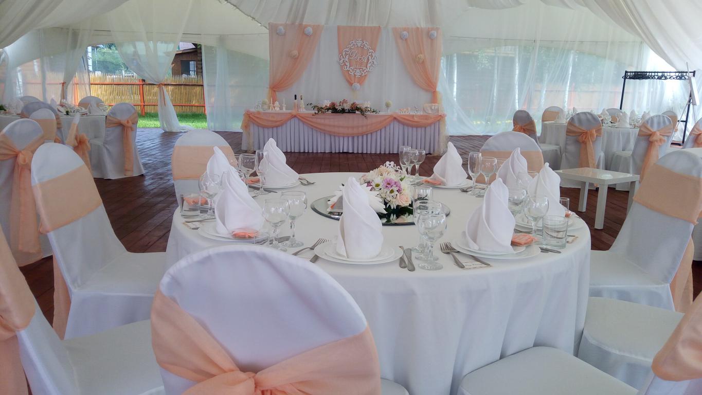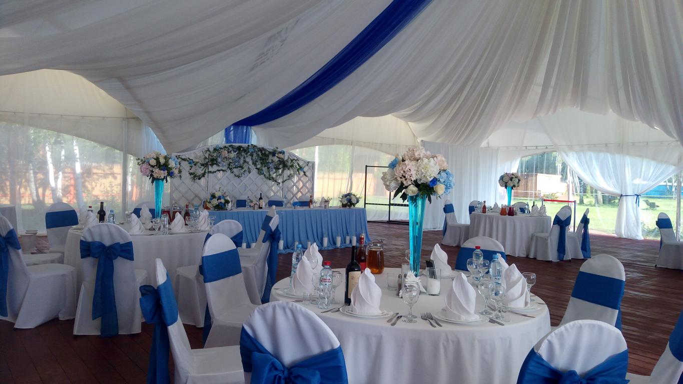 Белоснежный шатер с открытой верандой на берегу водохранилища с великолепным видом на большую воду. Шатёр полностью задрапирован. Драпировка цвет белый. Дополнительный цвет любой. Шатёр арочный. Площадь шатра 400 кв.м. (20х20м).