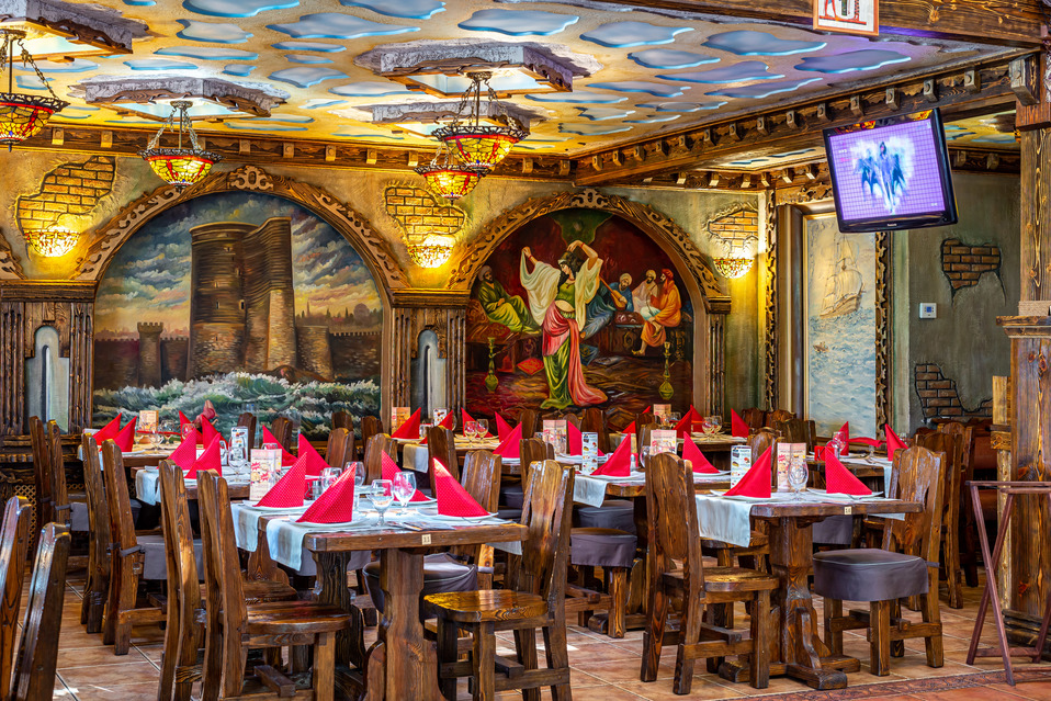 «Сказка Востока» – это большой многозальный ресторан, гармонично сочетающий в своем оформлении европейский стиль и восточные мотивы, отражающиеся в причудливых резных узорах интерьера и настенных восточных фресках.