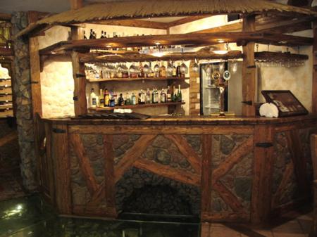 Отделка помещения выполняет не только эстетическую, но и тематическую функцию. Например, для барной стойки, расположенной слева от входа в«Старый Баку», были использованы отделочный камень, стекло и дерево. Для зала были выбраны те же материалы.