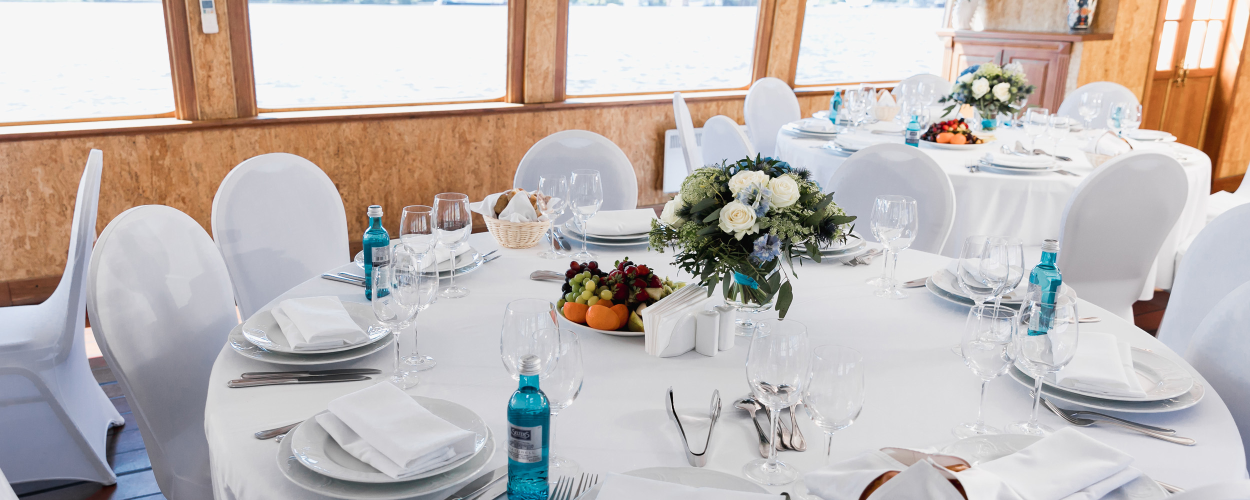 Нижняя палуба – это банкетный зал с баром и танцполом. Интерьер своей дорогой отделкой поддерживает заявленный класс комфортности, а тонированные окна создают полное ощущение приватности.