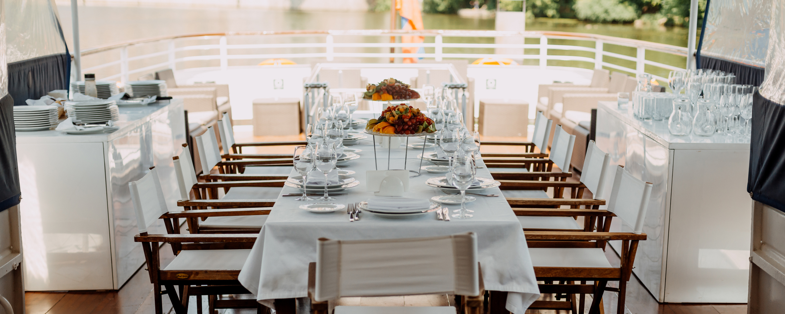 Верхняя палуба - частично крытая терраса с великолепным обзором. Здесь могут быть организованы лаундж зона с мебелью из ротанга или велком-фуршет с коктейльными столами.