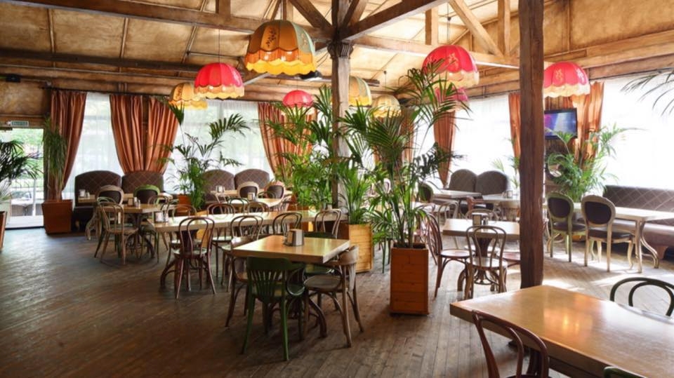 Зал обставлен лаконичными столиками, состаренными венскими стульями, мягкими креслами и клетчатыми диванчиками.