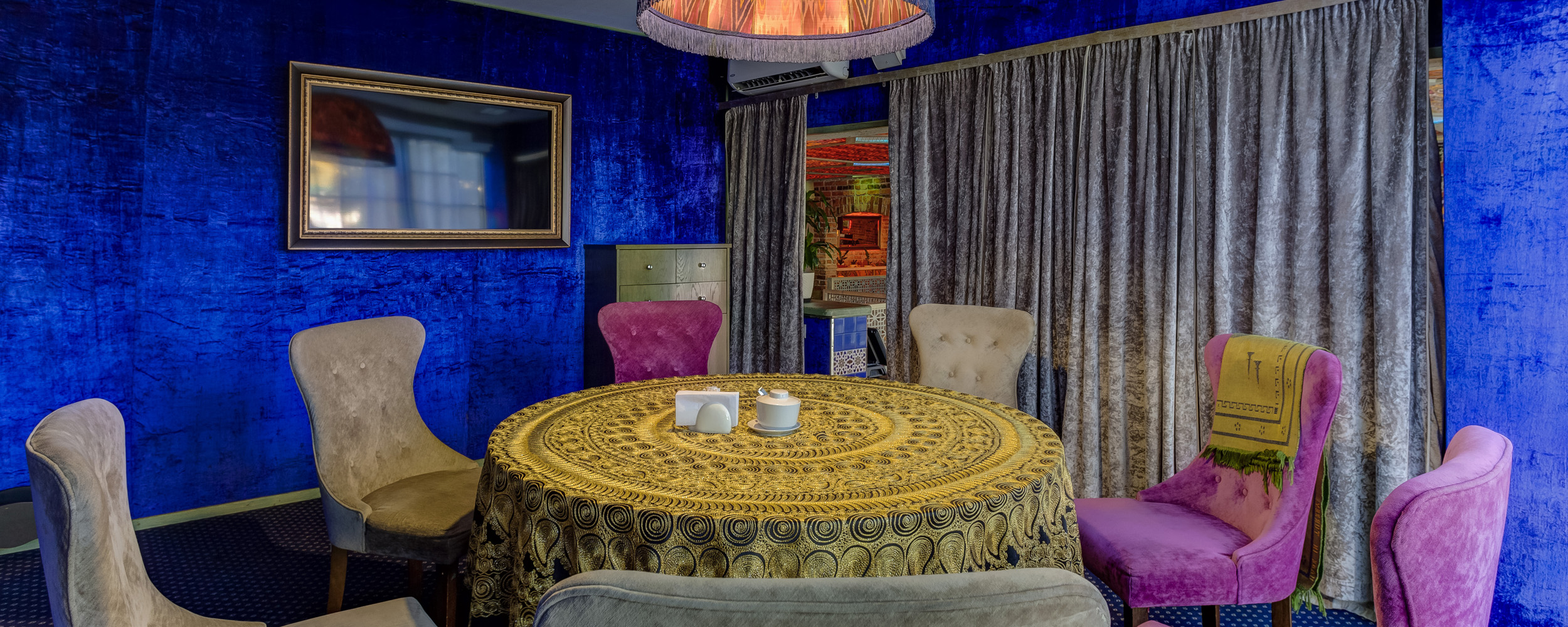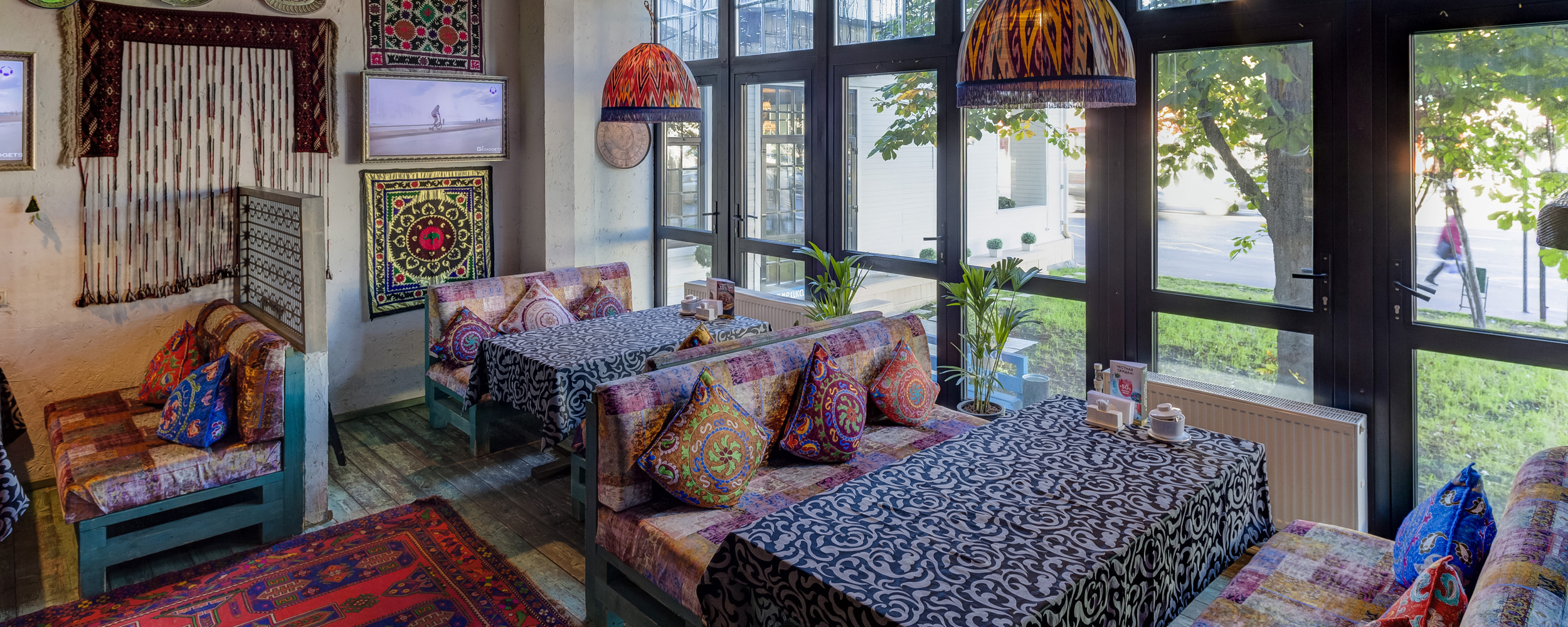 Весной и летом здесь приятно пообедать или поужинать на открытой террасе, зажмурившись под солнечными лучами как местный любимец – кот Захар, вдыхая аромат жарящихся на мангале шашлыков. А пасмурным осенним днём насладиться обволакивающим теплом гостиной, утонув в мягких подушках её диванов. Здесь можно отдохнуть за кальяном или настольными играми, за поглощением настоящего узбекского плова, приготовленного в казане, или оценить усилия ресторанного сушиста, попробовав его роллы.