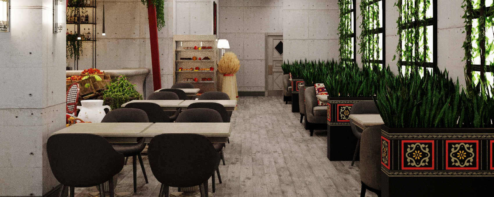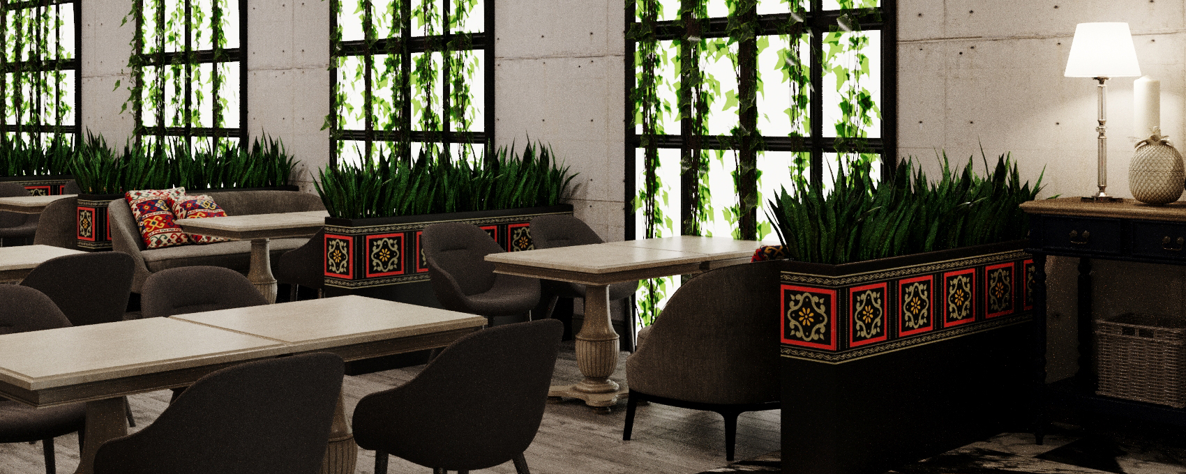 Уютный зал, трансформер, любая конфигурация по выставлению столов, вип зал на 16 человек, мягкое теплое освещение, множество зелени и виноградной лозы, люстры из корзин, барная стойка с изображением традиционного грузинского застолья.