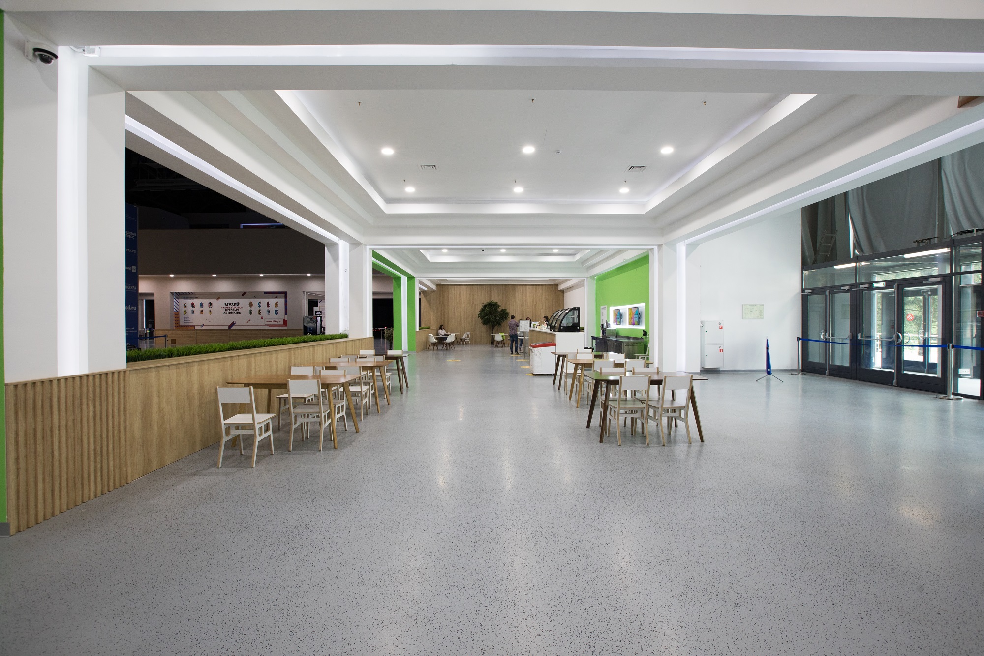 Входная и буфетная зона может быть трансформирована в welcome-зону для вашего мероприятия. Конфигурация павильона позволяет зонировать мероприятие на несколько пространств под различные активности и создавать нестандартные декорации.