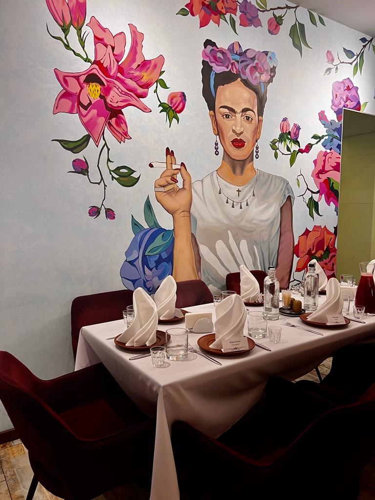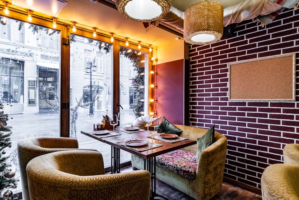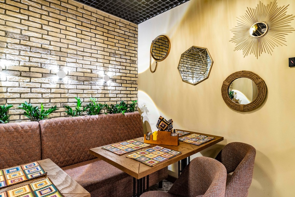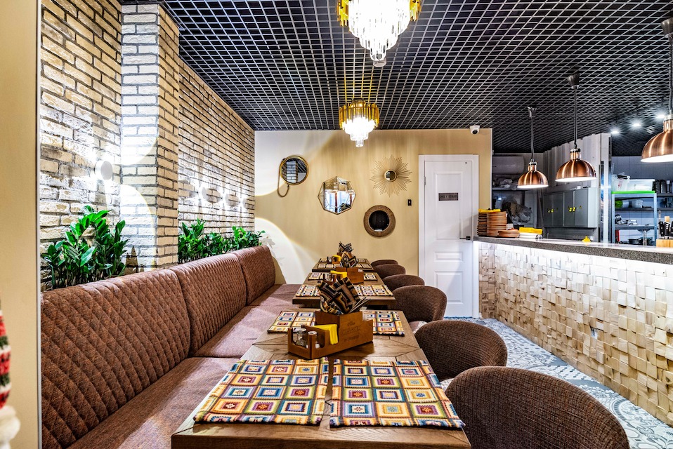 Ресторан «Жарим по-грузински» с порога очаровывает кавказским колоритом и окутывает теплом домашнего уюта. Яркие ковры и тканые салфетки с этническим узором, элементы национальных костюмов и плетёные абажуры — только пейзаж за панорамными, в пол, окнами и напоминает о том, что вы всё ещё в российской столице, а не в радушном тбилисском доме, где в честь дорогих гостей вот-вот начнётся шумное и изобильное застолье.