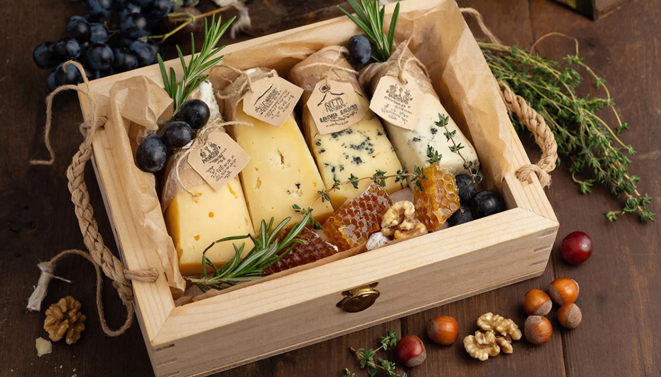 - Дегустационный набор сыров или мясных деликатесов: выберите ассорти из разных стран с орехами, мёдом и крекерами. Это готовый романтический ужин.
