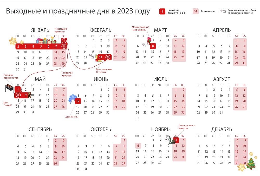 Отдыхать будем с 31 декабря по 8 января. 9 января — понедельник — первый рабочий день в 2023 году.