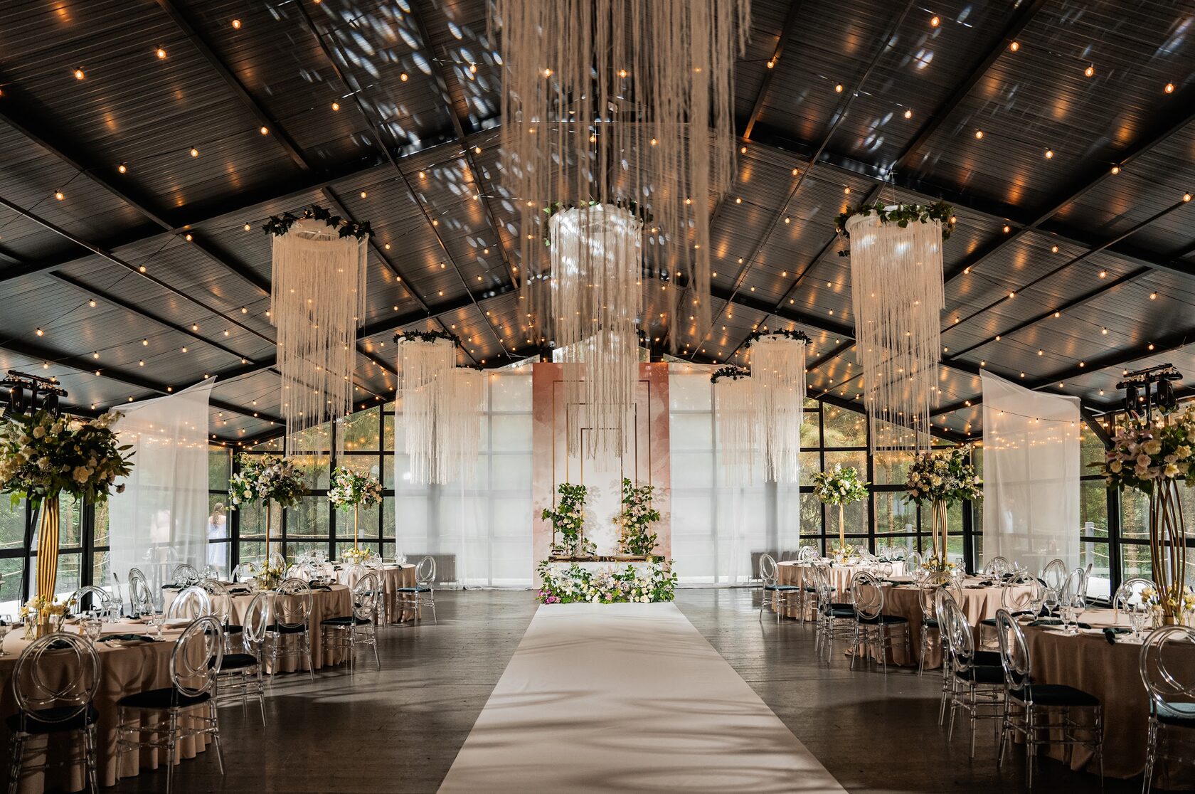 Ей нужна отдалённость от повседневности: загородный особняк, лофт с историей, шатёр на берегу озера или в парке, банкетный зал в отеле. Место, где гости погружаются в праздник полностью, без оглядки на внешний мир.