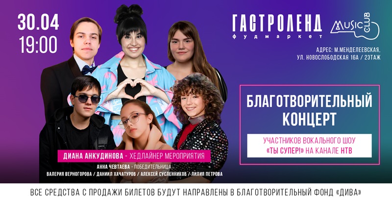 30 апреля состоится благотворительный концерт с участием Дианы Анкудиновой и самых ярких звезд ТВ-шоу "Ты супер!" на главной сцене Фудмаркета Гастроленд Music Club.