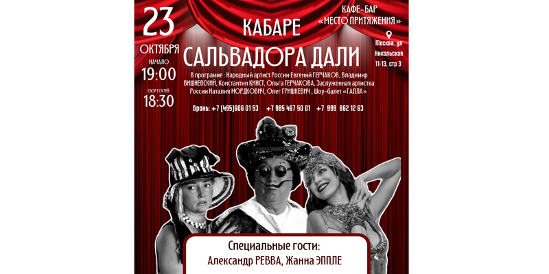 Кабаре Сальвадора Дали! Кабаре - шоу разных жанров и стилей, затрагивающее не только сердца людей, но и погружающее вас в мир искусства, живую историю.