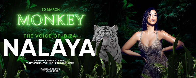 В последнюю субботу марта Monkey Club наполнится звучанием голоса Ибицы с элементами ритм-блюза, соул и латинской музыки. Из жгучей Испании приедет резидент главных фестивалей и ночных клубов — очаровательная певица NALAYA прямо в тропический оазис Москвы и исполнит популярные треки в формате камерного event-пространства.