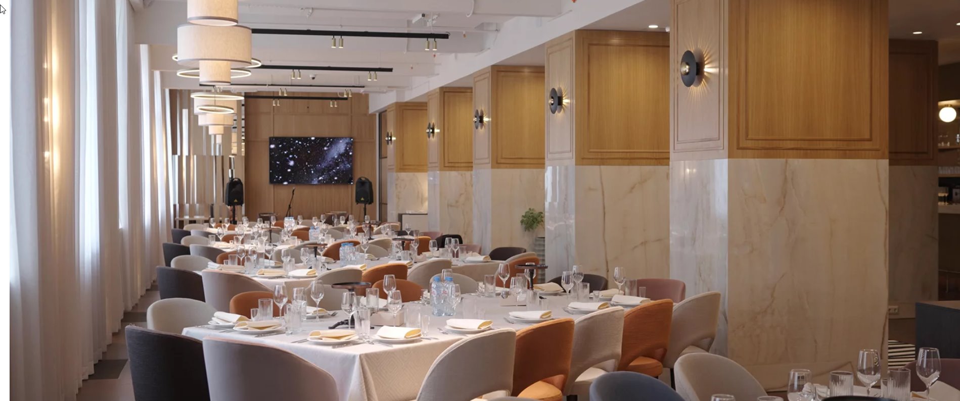 В вашем распоряжении основной зал ресторана для проведения банкета до 100 человек, фуршета до 150 человек. В зале имеется большой экран для трансляции любого видеоряда, сцена-подиум с музыкальным оборудованием. Освещение в зале можно настроить на Ваш вкус.
