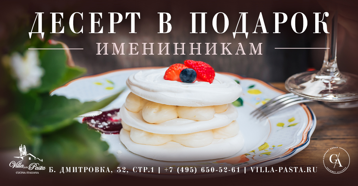 Ресторан итальянской кухни Вилла Паста на ул. Большая Дмитровка обещает всем именинникам вкусный и изысканный десерт в подарок.