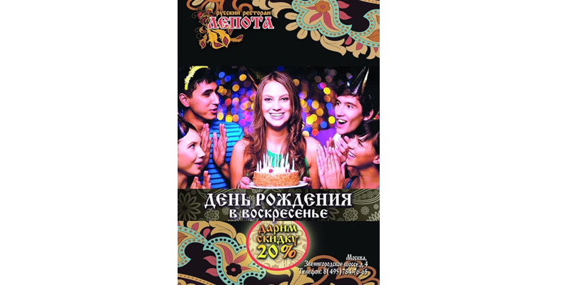 Приходите с друзьями в русский ресторан Лепота отметить свой День рождения! В воскресенье мы подарим вам скидку - 20%