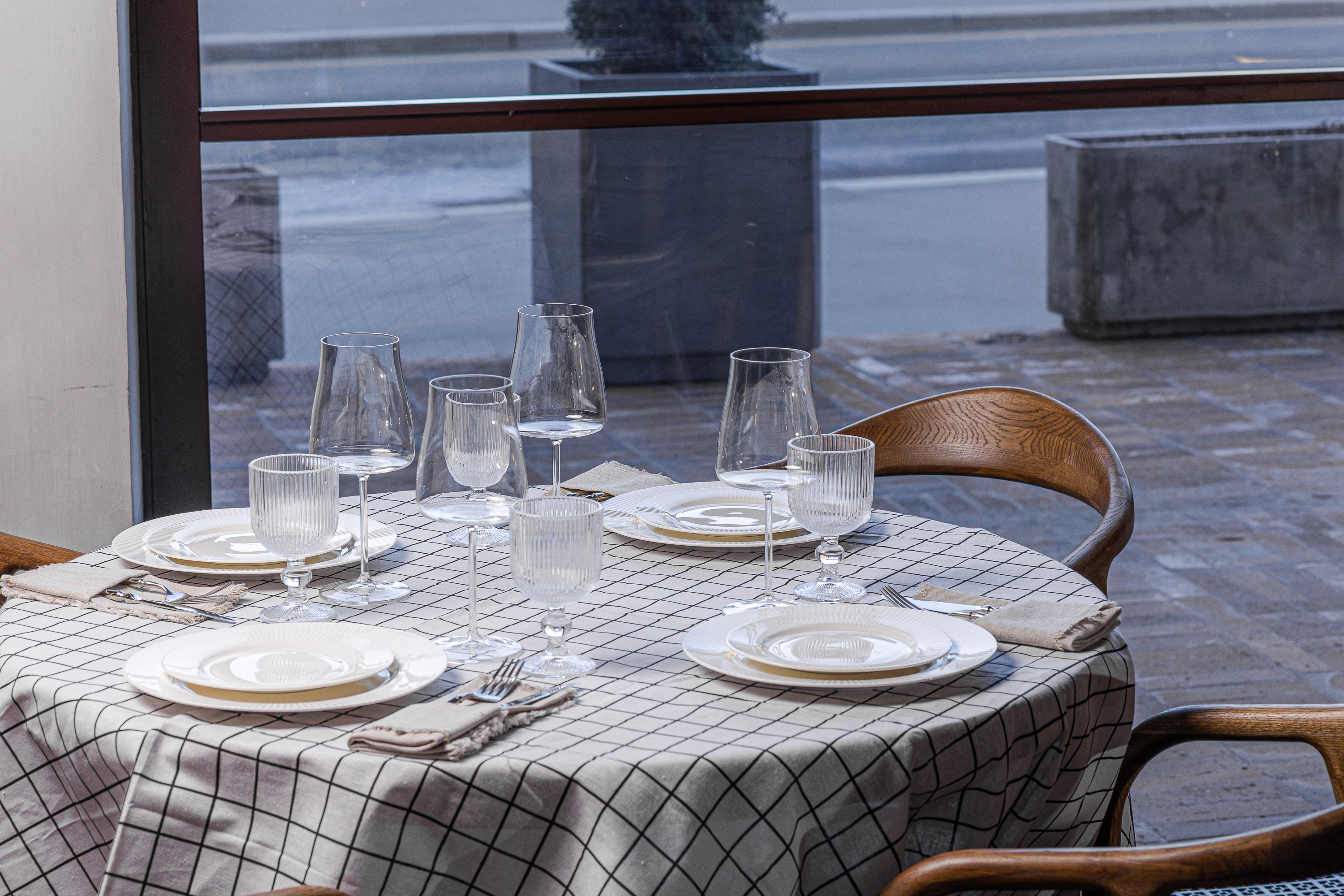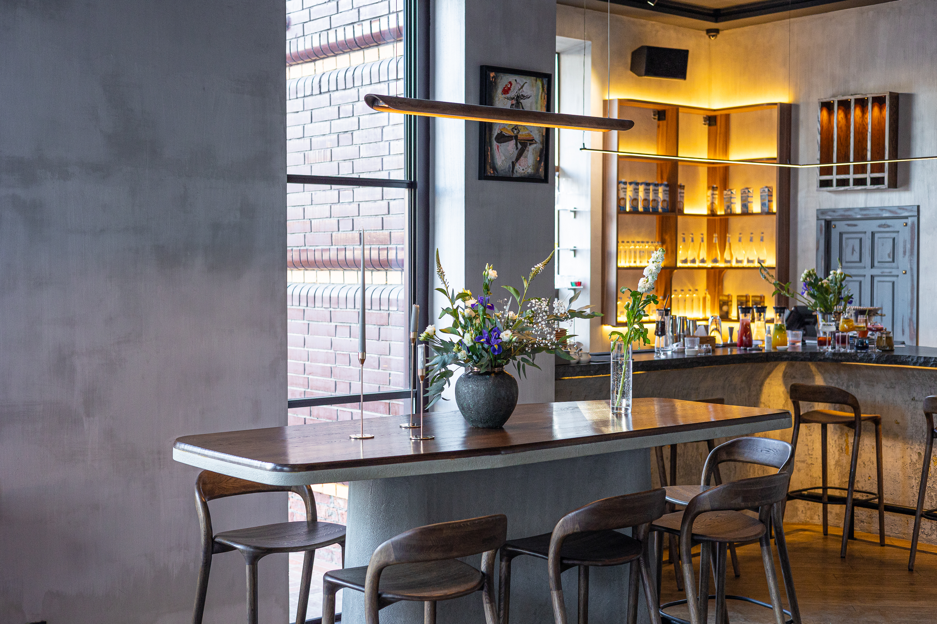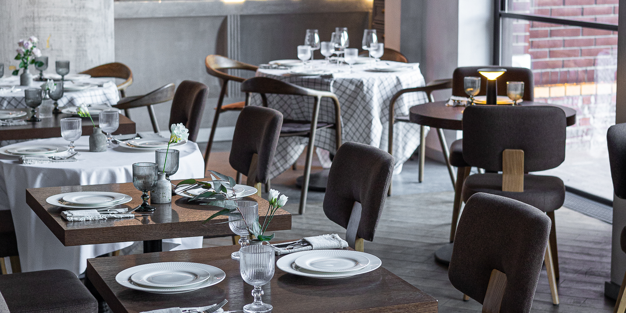 Зал ресторана — это сдержанная элегантность и современный дизайн: натуральные материалы (бетон, дерево, кожа), много света, зеркала, стеклянная витрина и живые растения. 50 посадочных мест расположены так, чтобы гости чувствовали себя комфортно, а праздник — частный или корпоративный — выглядел безупречно.