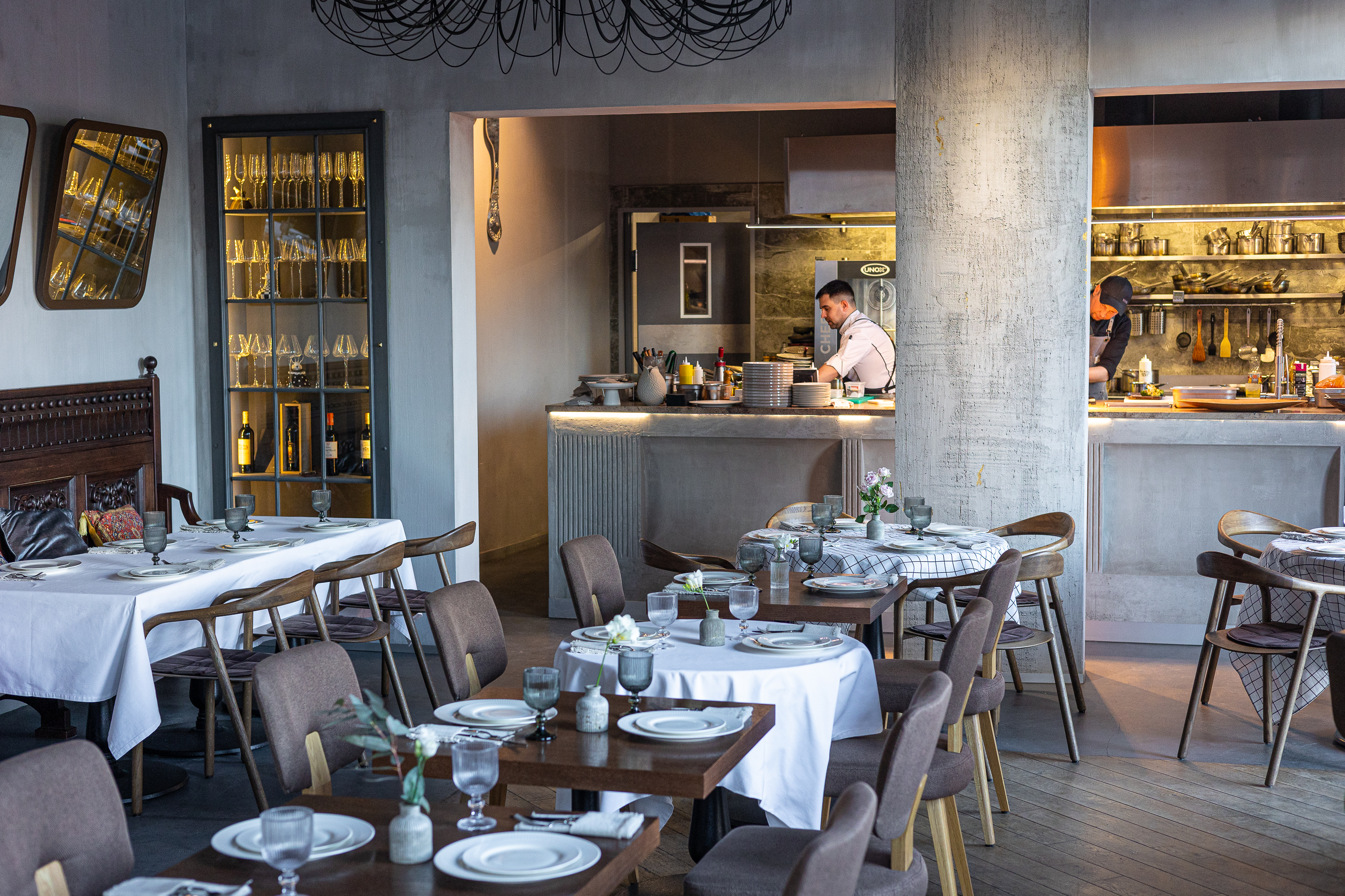 Зал ресторана — это сдержанная элегантность и современный дизайн: натуральные материалы (бетон, дерево, кожа), много света, зеркала, стеклянная витрина и живые растения. 50 посадочных мест расположены так, чтобы гости чувствовали себя комфортно, а праздник — частный или корпоративный — выглядел безупречно.