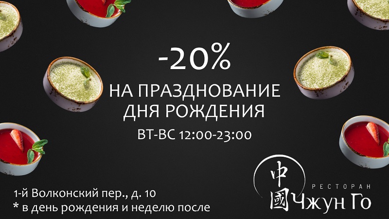 В честь Вашего Дня Рождения ресторан «Чжун Го» дарит имениннику приятный подарок – десерт и скидку 20% на все меню!
