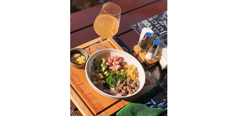 Рецепт довольно прост — мелко нарезанная отварная картошка, свежий огурец и редис, вареные яйца, колбаса, говядина, много свежей зелени и заправить подходящим напитком: