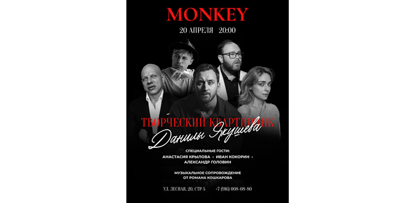 20 апреля MONKEY DINNER перенесет вас на творческий квартирник Данилы Якушева. Российский актер театра и кино станет хедлайнером субботней ночи, пока приглашенные артисты Александр Головин, Иван Кокорин и Анастасия Крылова прочтут стихи, и Monkey Club станет источником входновения.