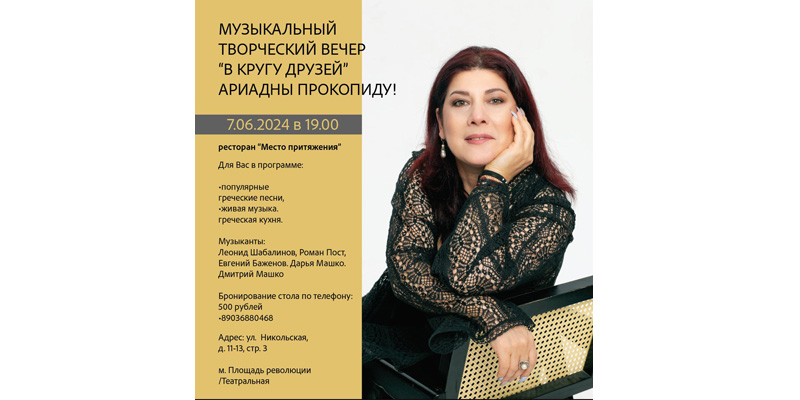 ?Приглашаем вас на творческий музыкальный вечер "В кругу друзей" Ариадны Прокопиду!