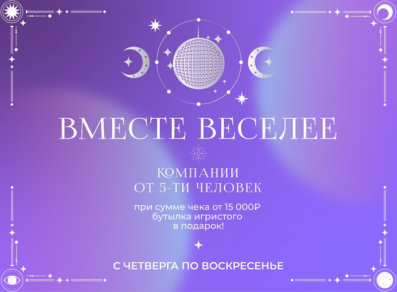 «Вместе веселее» - компании от 5-ти человек, при сумме чека от 15 000₽ бутылка игристого в подарок. Fillary