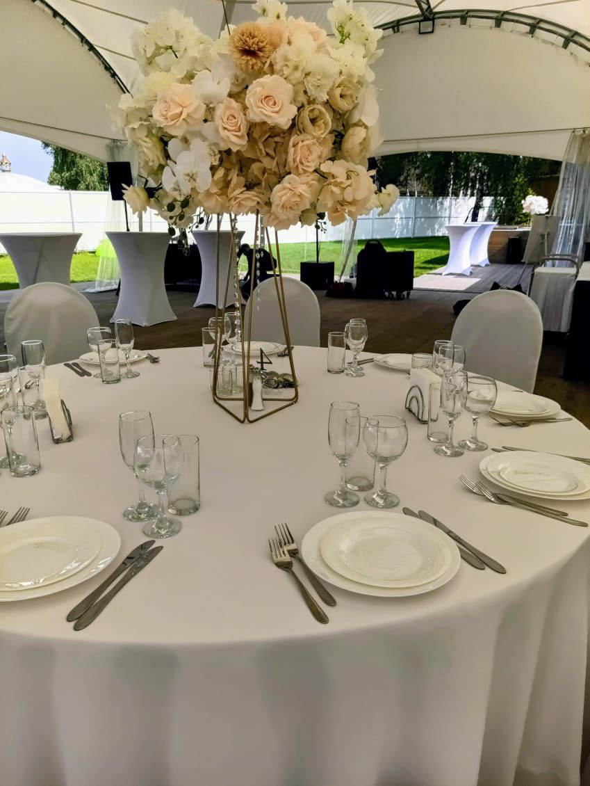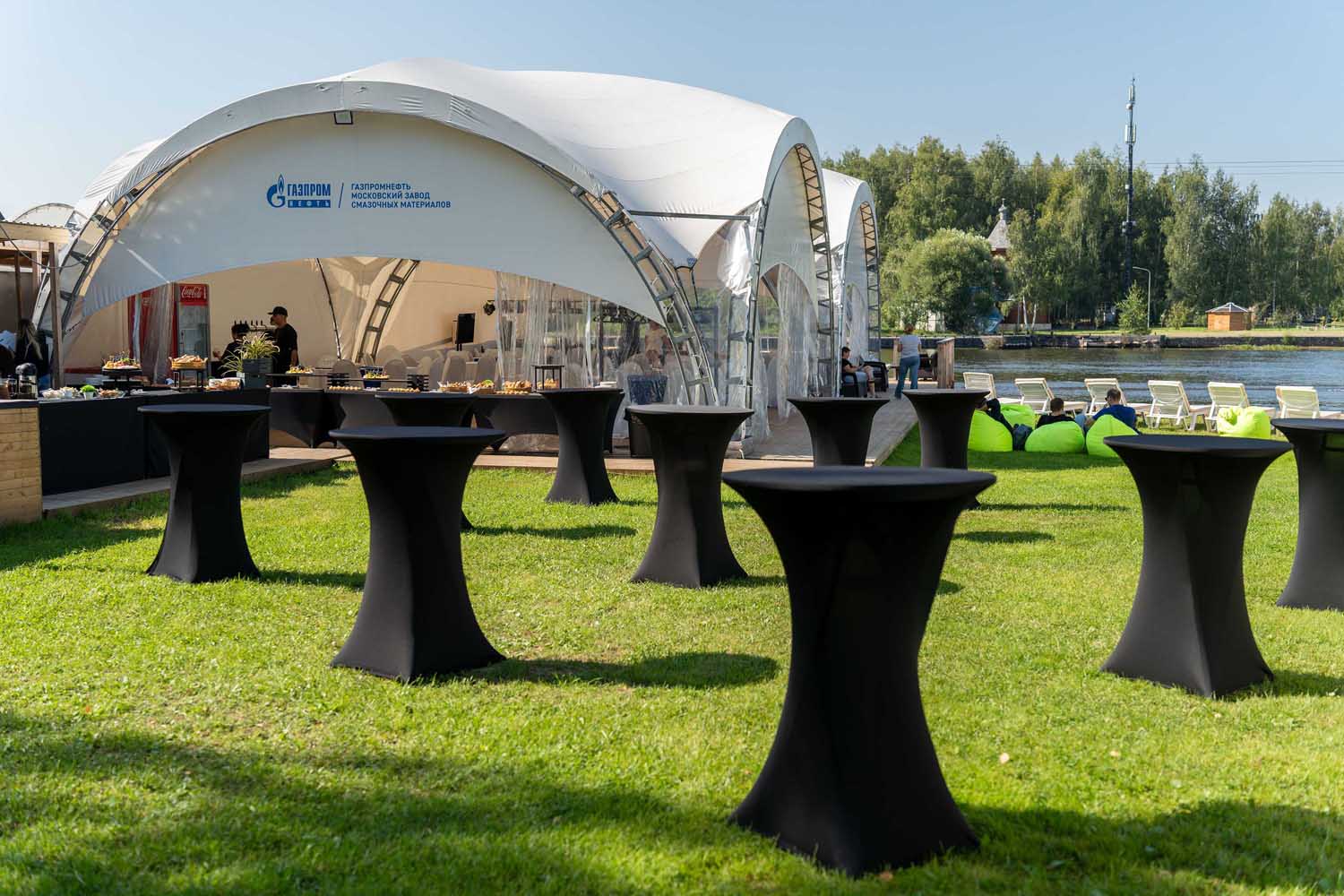 Белоснежный арочный шатёр с открытой верандой, расположенный в 11 км от Москвы, на берегу Клязьминского водохранилища, площадь шатра 200кв.м. (20х10м).