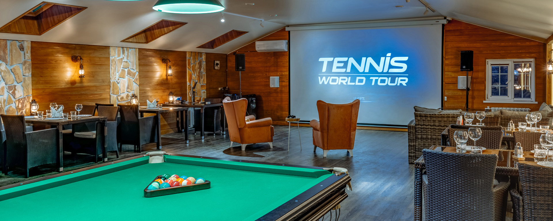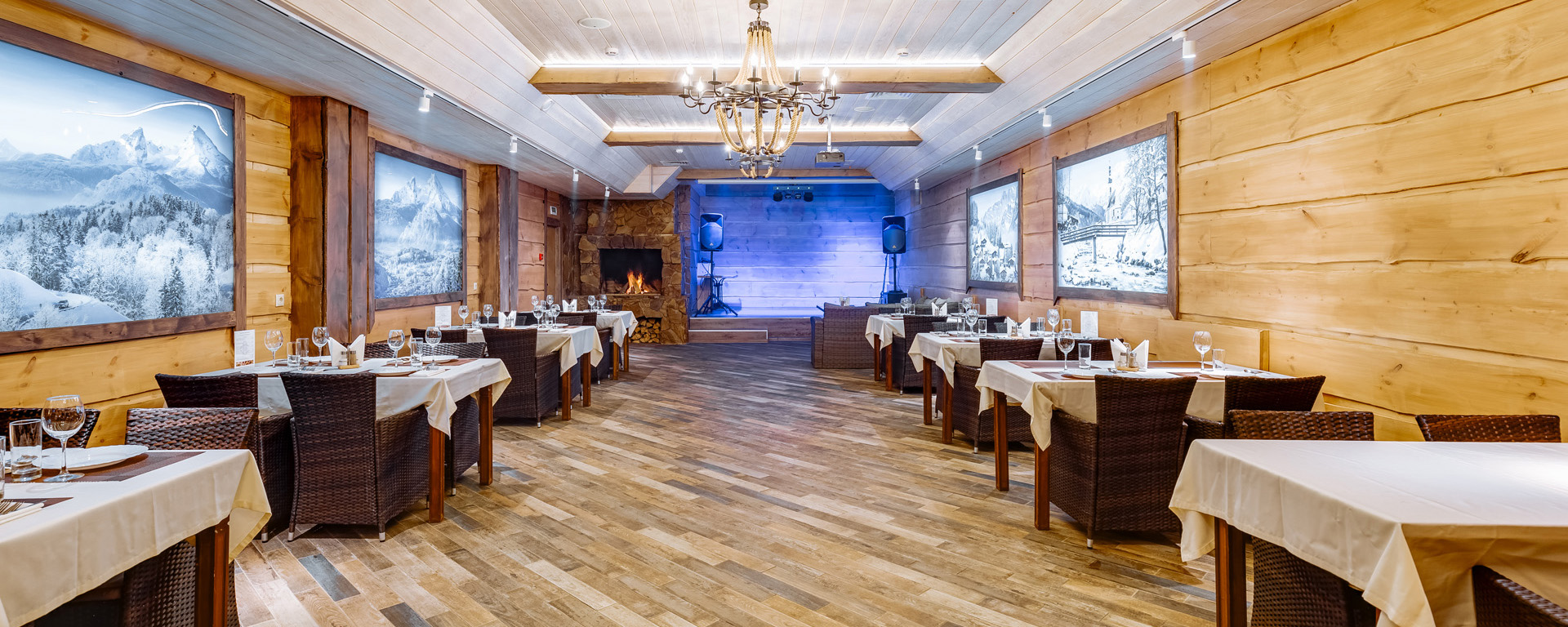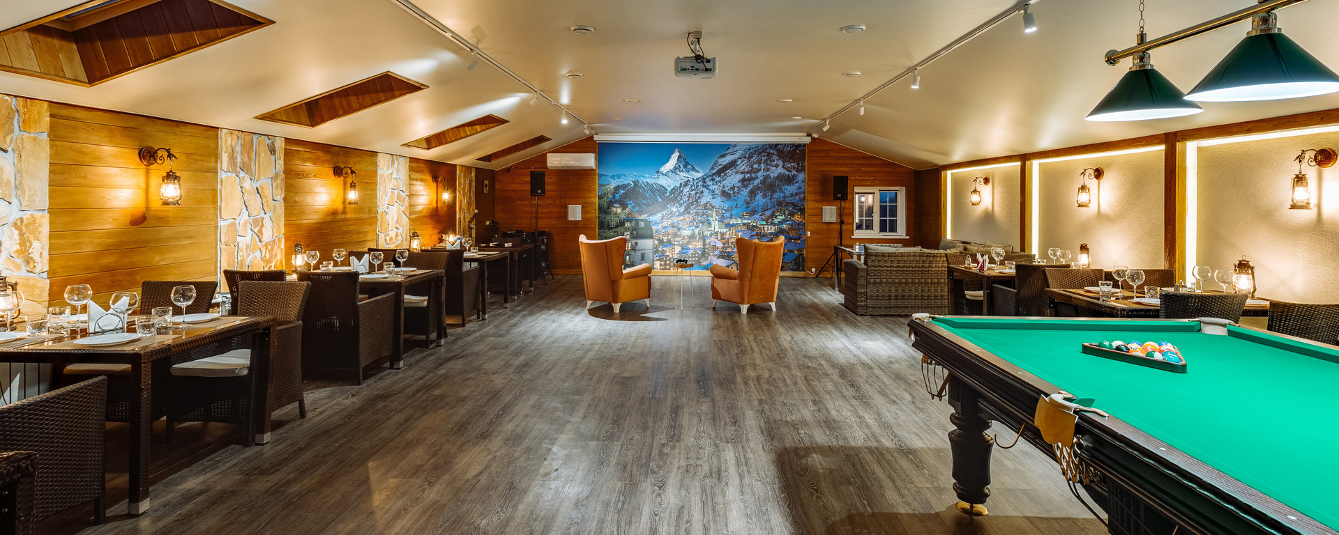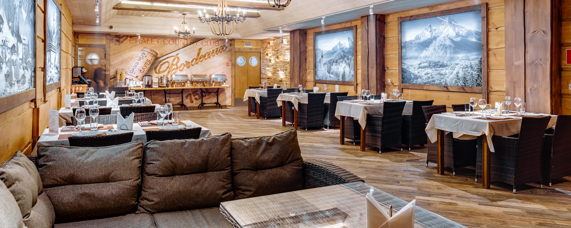 В лобби загородного клуба можно отдохнуть в мягких креслах у камина, интерьер украшаютдекоративные элементы из камня и натурального дерева. В Chalet Сountry Сlubесть банкетныйзал, оформленный в швейцарском стиле, уютно смотрящийсявтёплом свете керосиновых ламп.Менюзагородного клуба может порадоватьсамого изысканного гурмана авторскими блюдами европейской кухни и традиционными швейцарскими деликатесами.Залоснащенпроекционным оборудованием с большимэкраном для кинопоказов и современной системойкараоке.