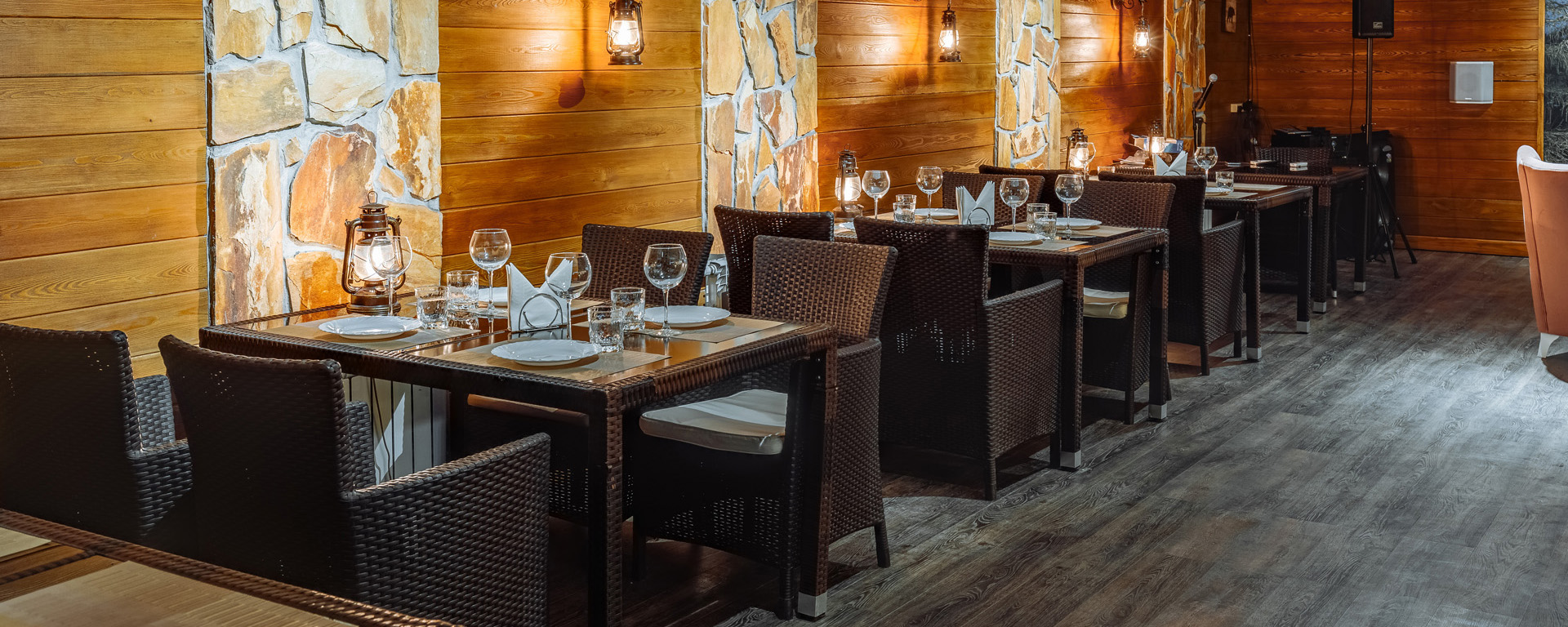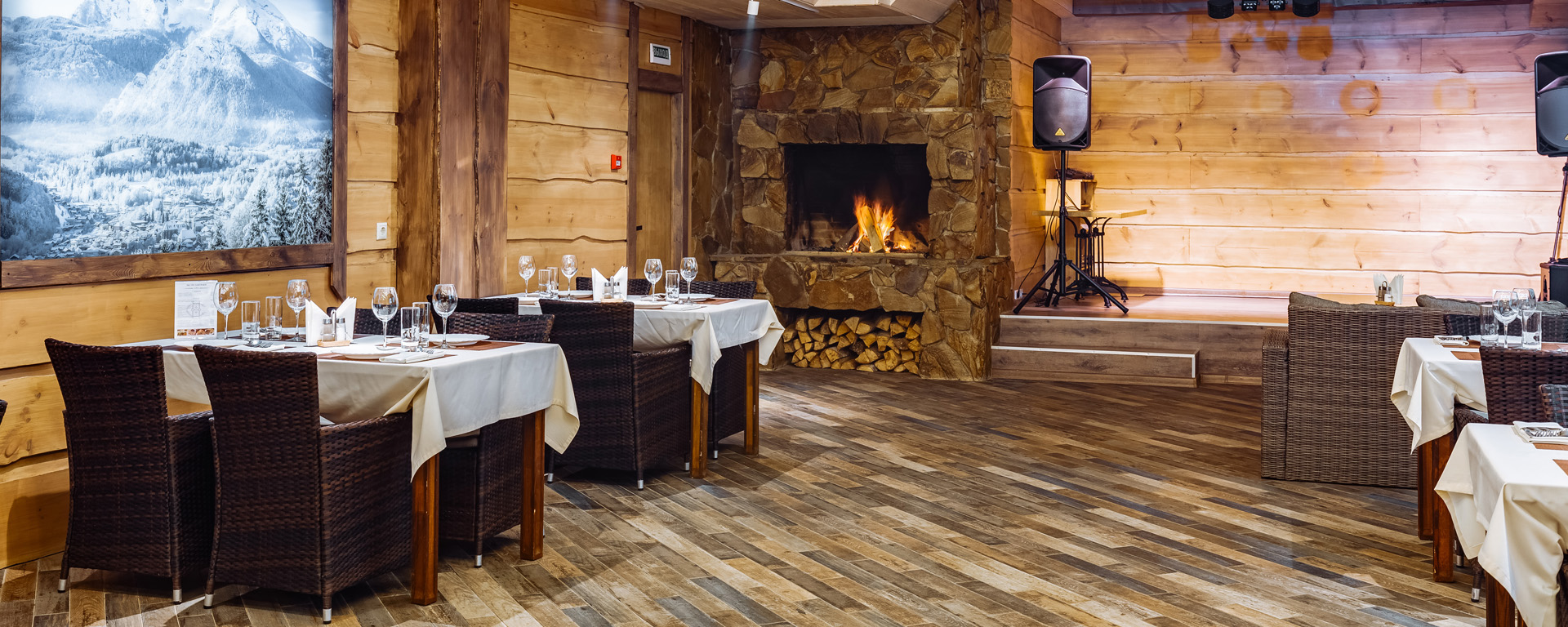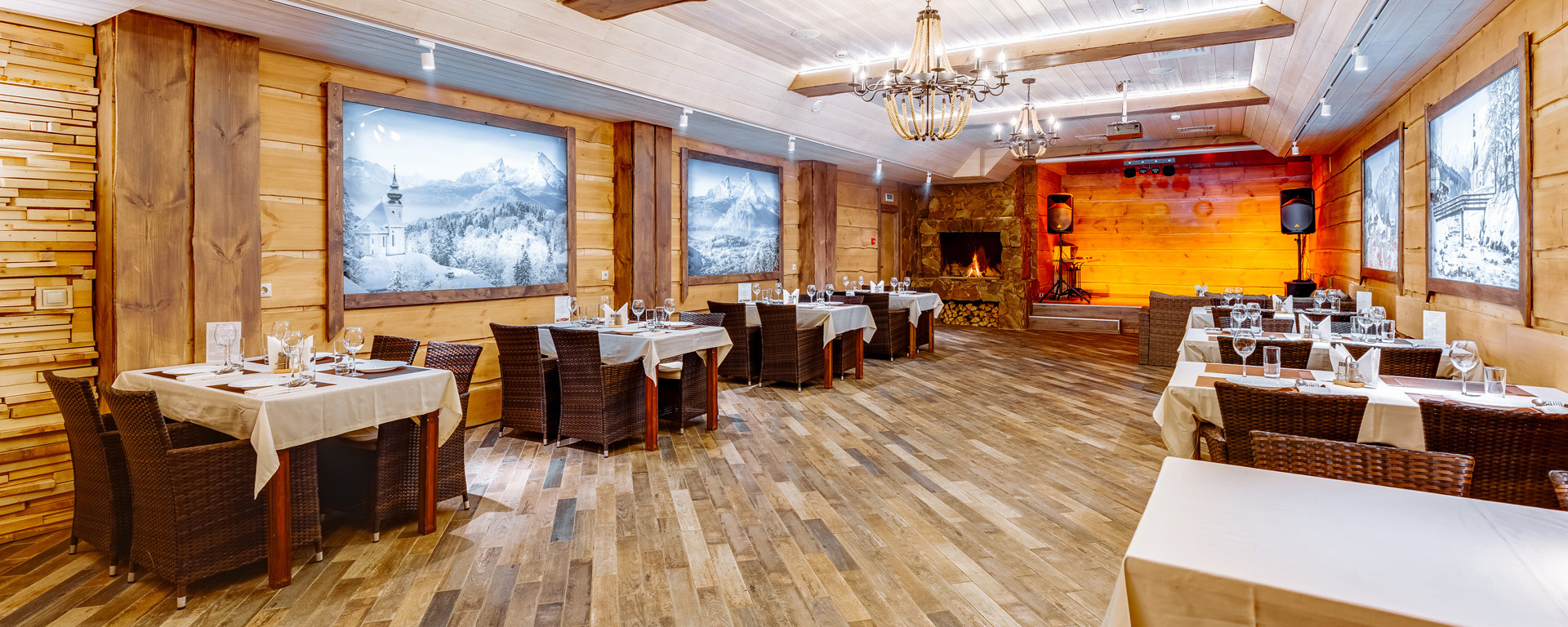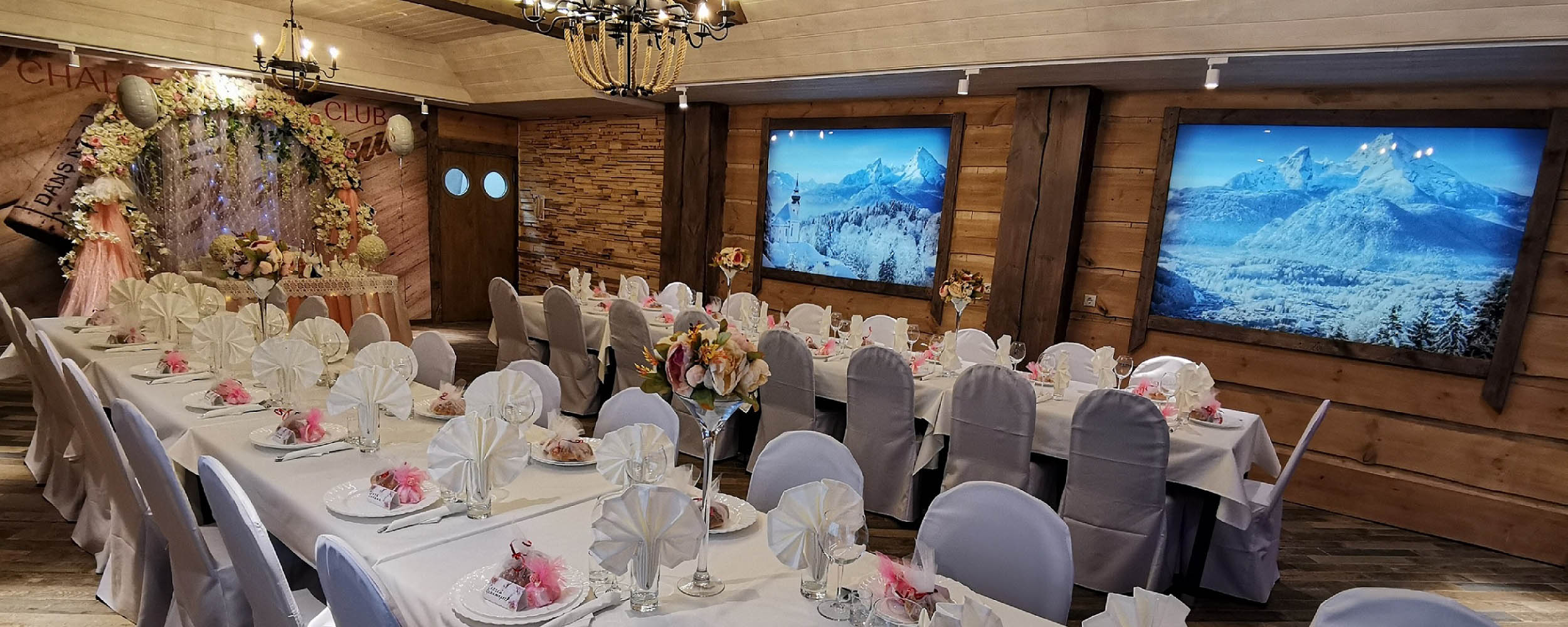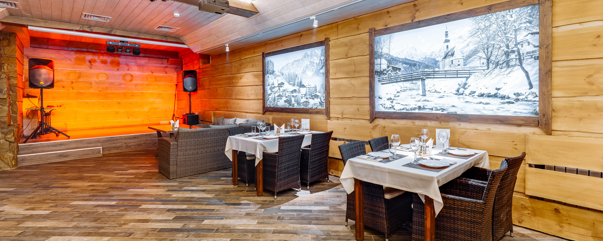 В лобби загородного клуба можно отдохнуть в мягких креслах у камина, интерьер украшаютдекоративные элементы из камня и натурального дерева. В Chalet Сountry Сlubесть банкетныйзал, оформленный в швейцарском стиле, уютно смотрящийсявтёплом свете керосиновых ламп.Менюзагородного клуба может порадоватьсамого изысканного гурмана авторскими блюдами европейской кухни и традиционными швейцарскими деликатесами.Залоснащенпроекционным оборудованием с большимэкраном для кинопоказов и современной системойкараоке.