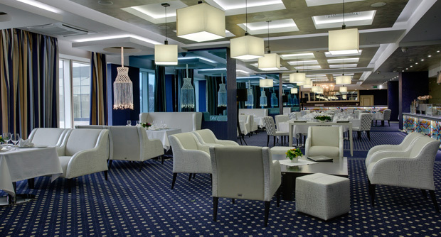 Интерьер продуман до мелочей и полностью соответствует высокому уровню ресторана. Мебель FENDI, посуда с позолотой, необычные люстры, эксклюзивные столовые приборы – в каждой детали чувствуется хороший вкус и особое отношение к гостям. Даже открытая кухня, расположенная в основном зале, не нарушает общей стилистики заведения, его светлого и открытого пространства.