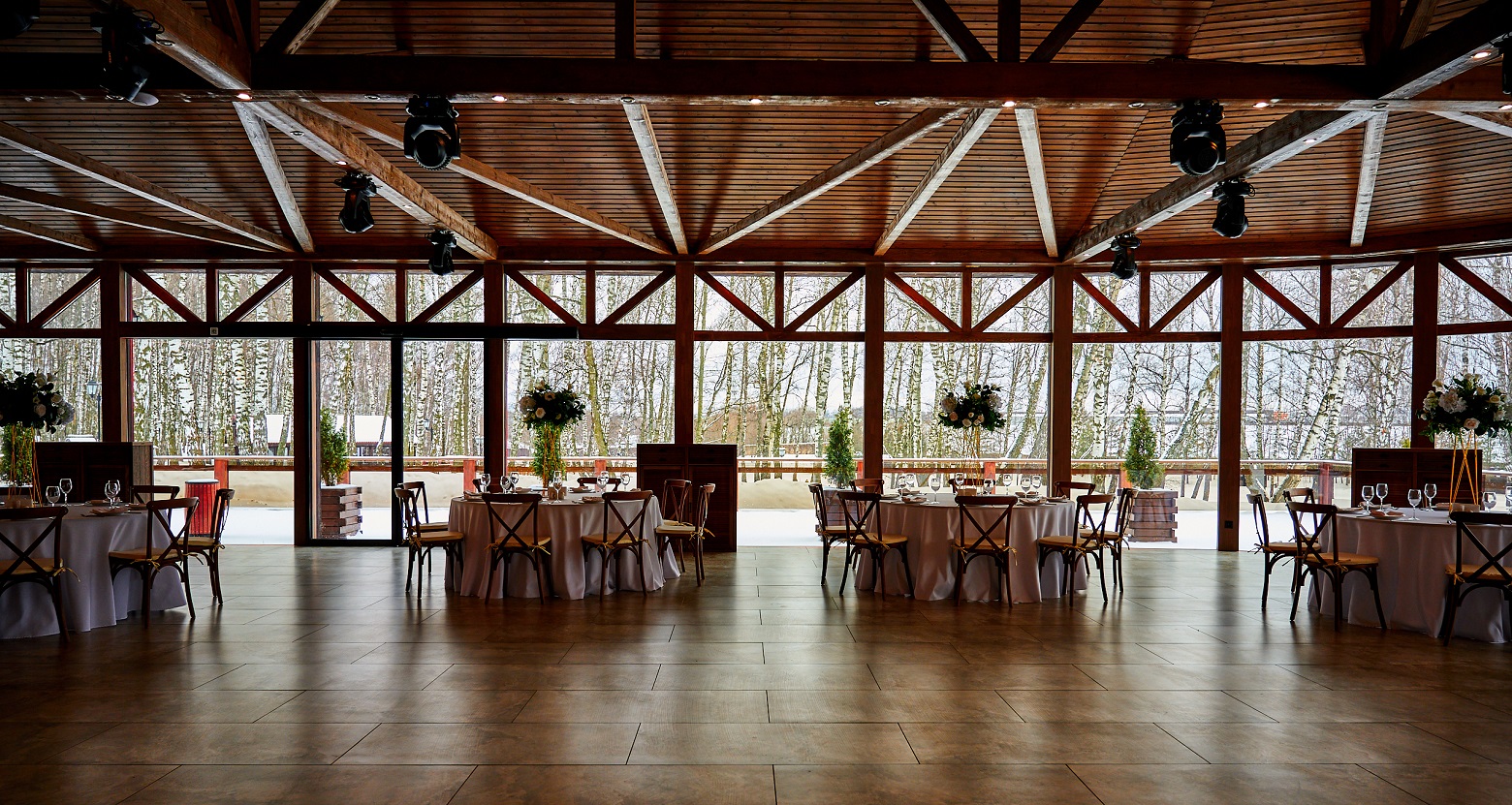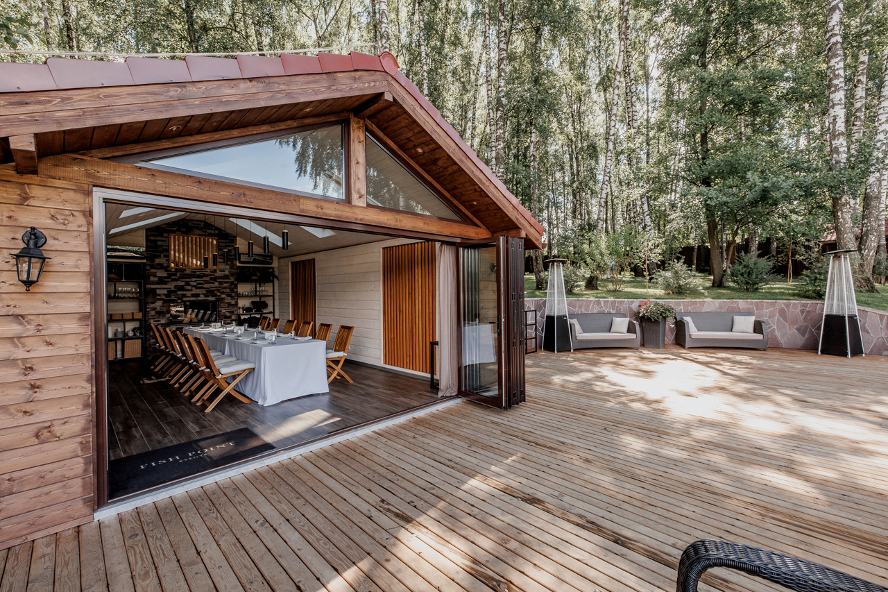 Эко-отель 4* на той же территории, что и площадки для мероприятий. Для событий, занимающих более одного дня, это прекрасная возможность продлить праздник. К услугам гостей – домики семейного формата и коттеджи на 10-12 человек, отдельный spa-центр с бассейном и русская баня. Все здания комплекса расположены в стороне от банкетных площадок и окружены пушистыми елями: мы заботимся о тишине и комфорте отдыхающих.